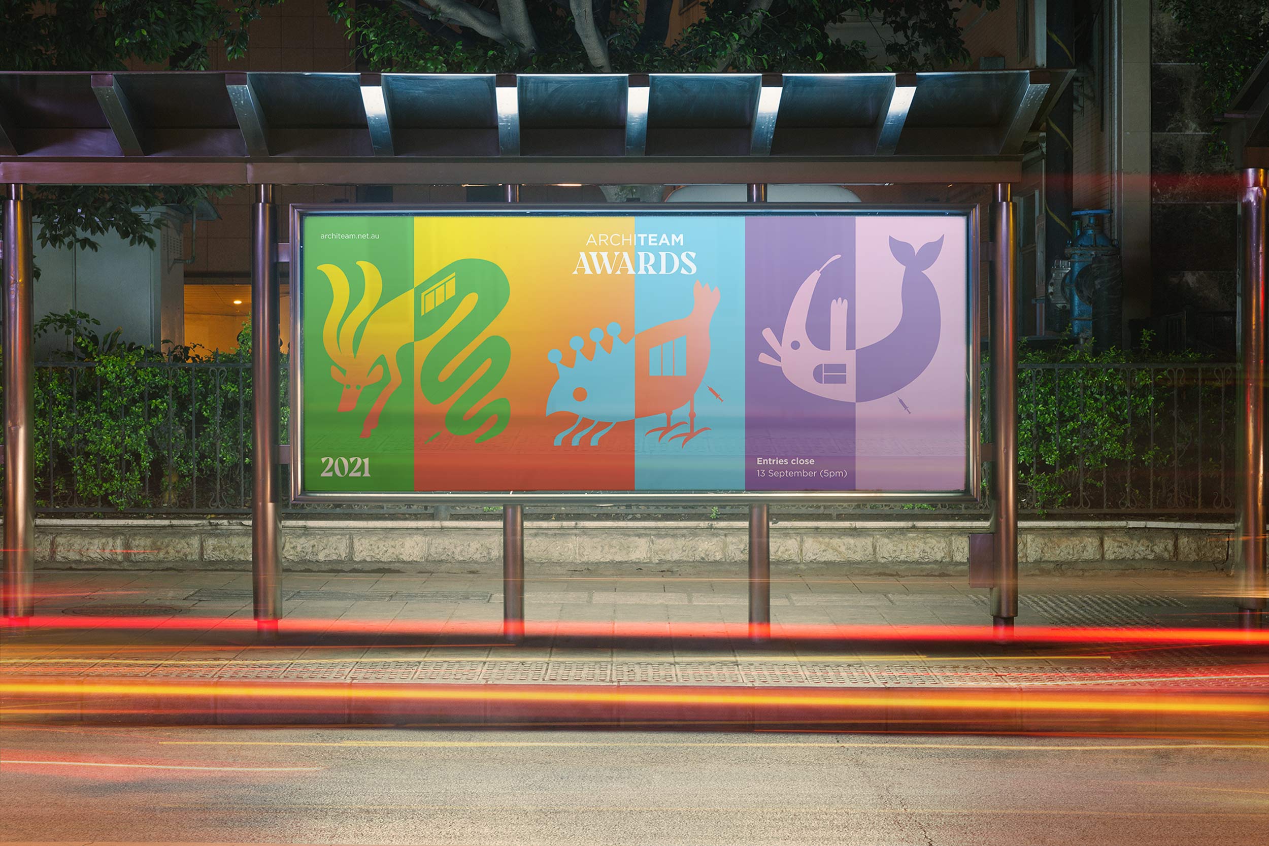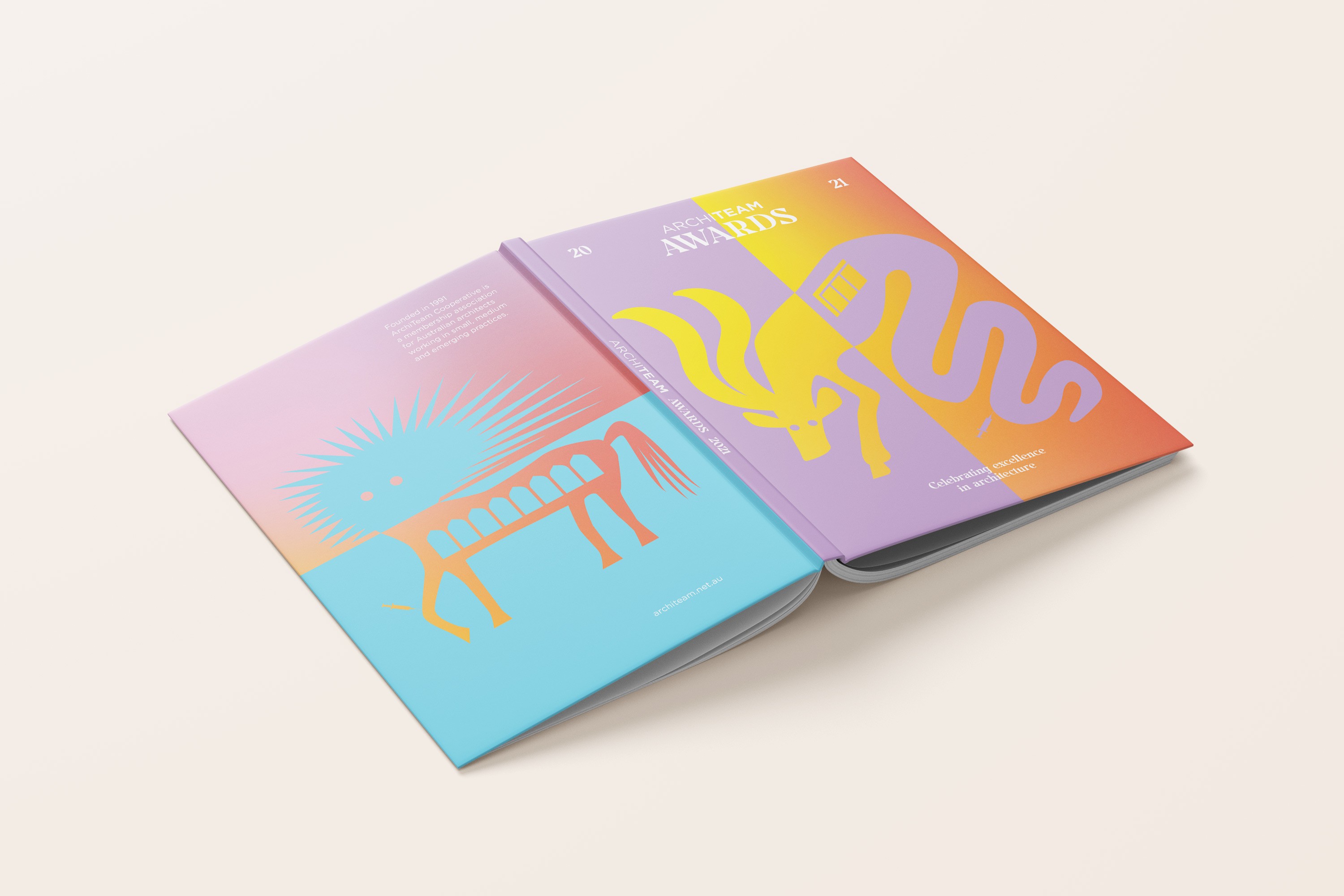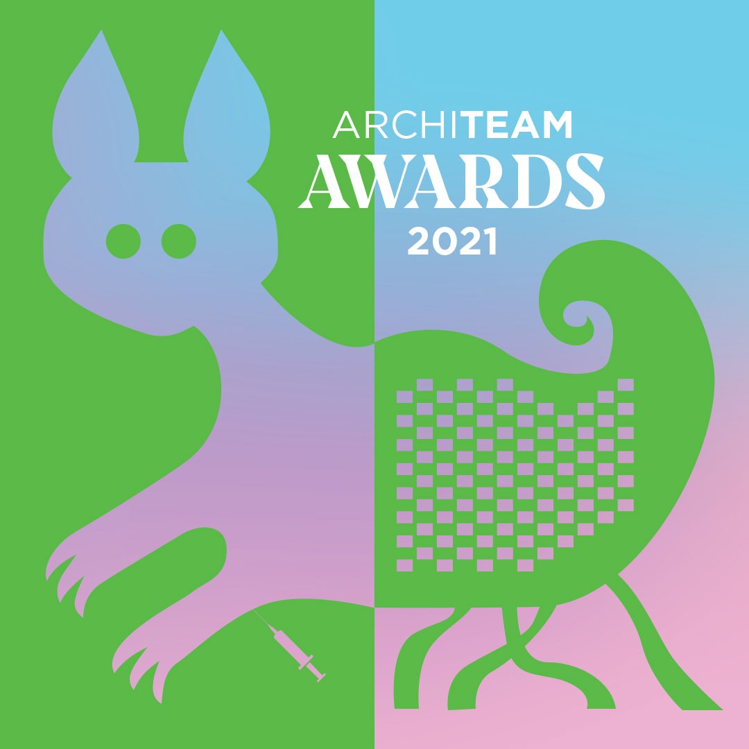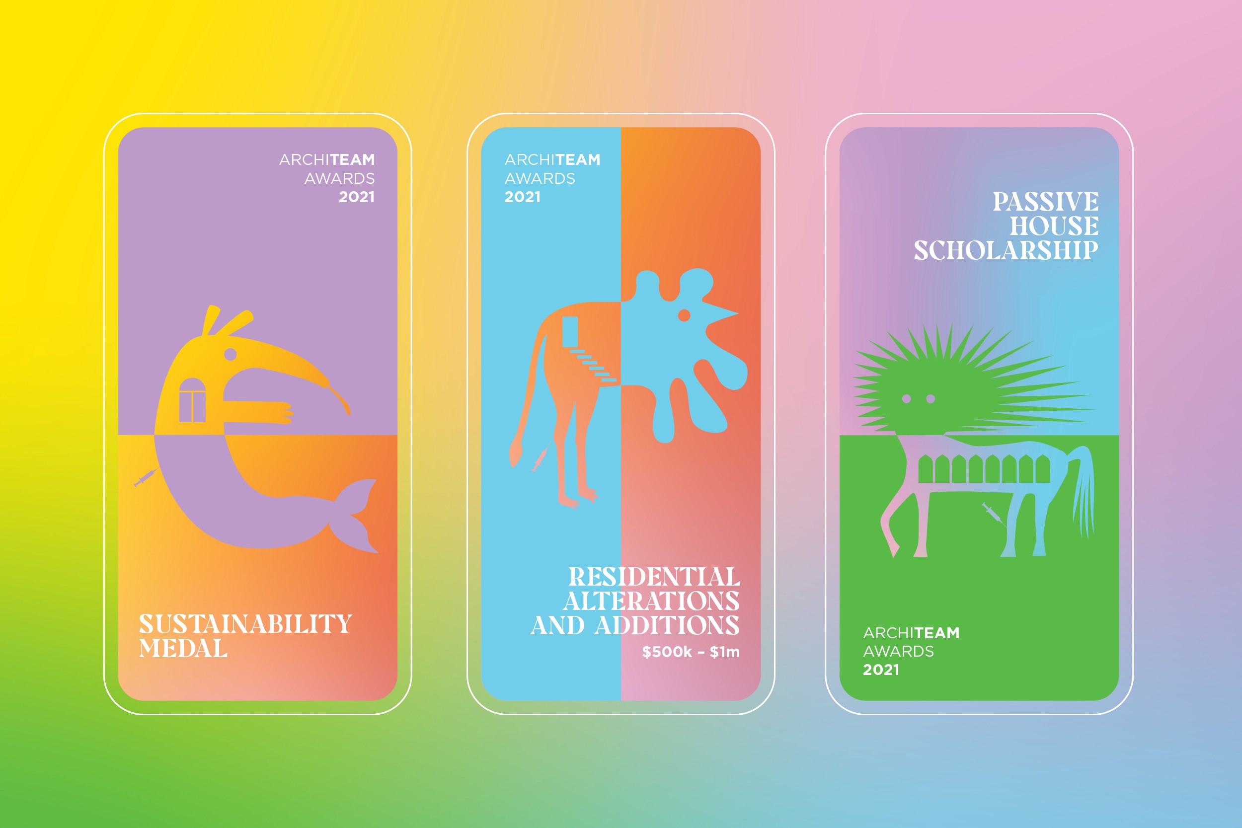 Dolphin/caterpillar. Rabbit/frog. Duck/turtle. Mythical fusions represent unexpected beauty through human intervention: how the most innovative architectural designs can emerge from unlikely combinations. The ArchiTeam Awards 2021 identity is a play on the largest category Architectural Alterations and Additions, with a nod to the pandemic. Each hybrid architectural beast is depicted “having their jab” in a link to the highly-charged COVID era. In glorious hypercolour, these beasts present as majestic and memorable, within an architectural branding landscape so often dominated by monochrome, rectilinear designs.