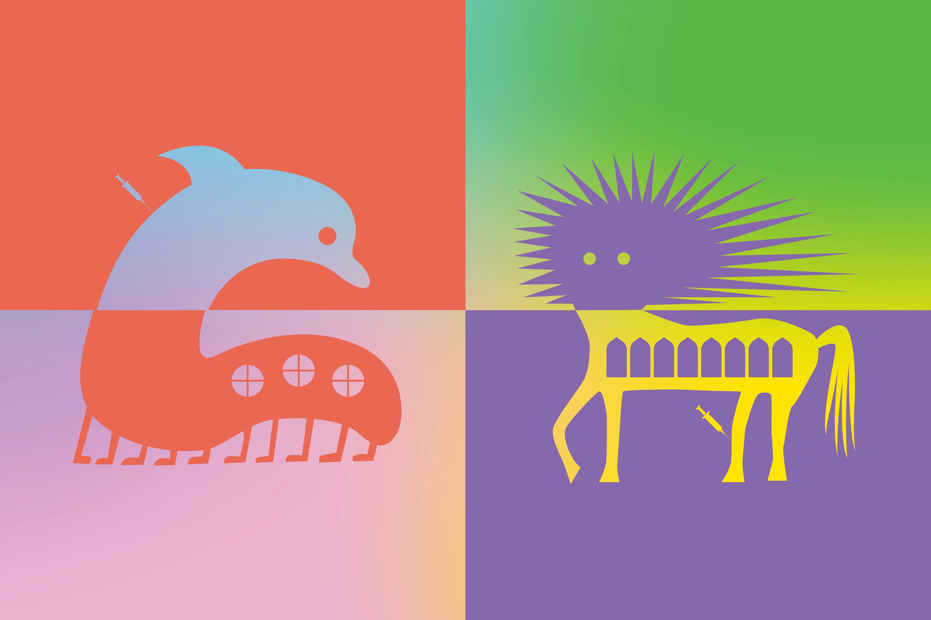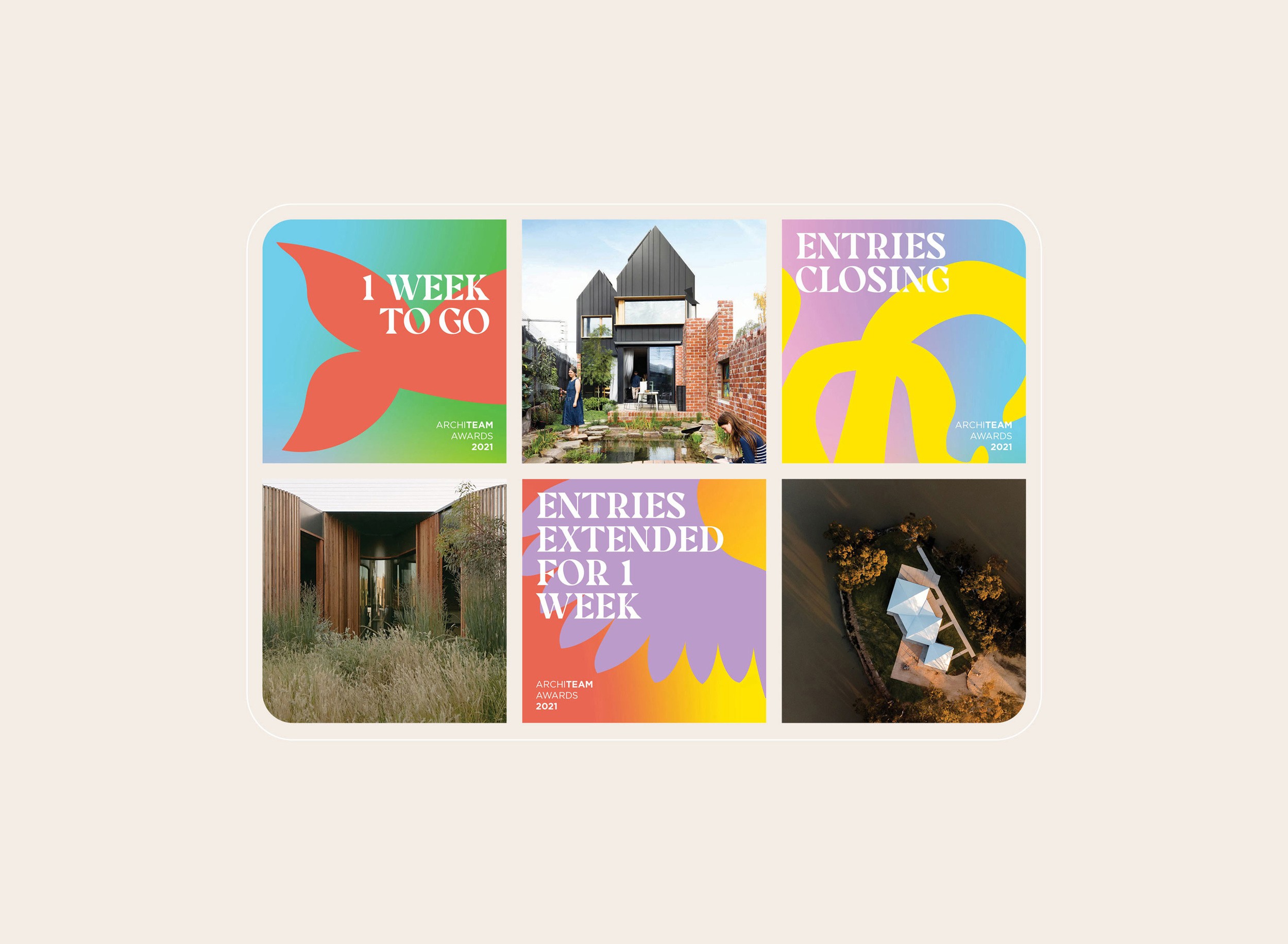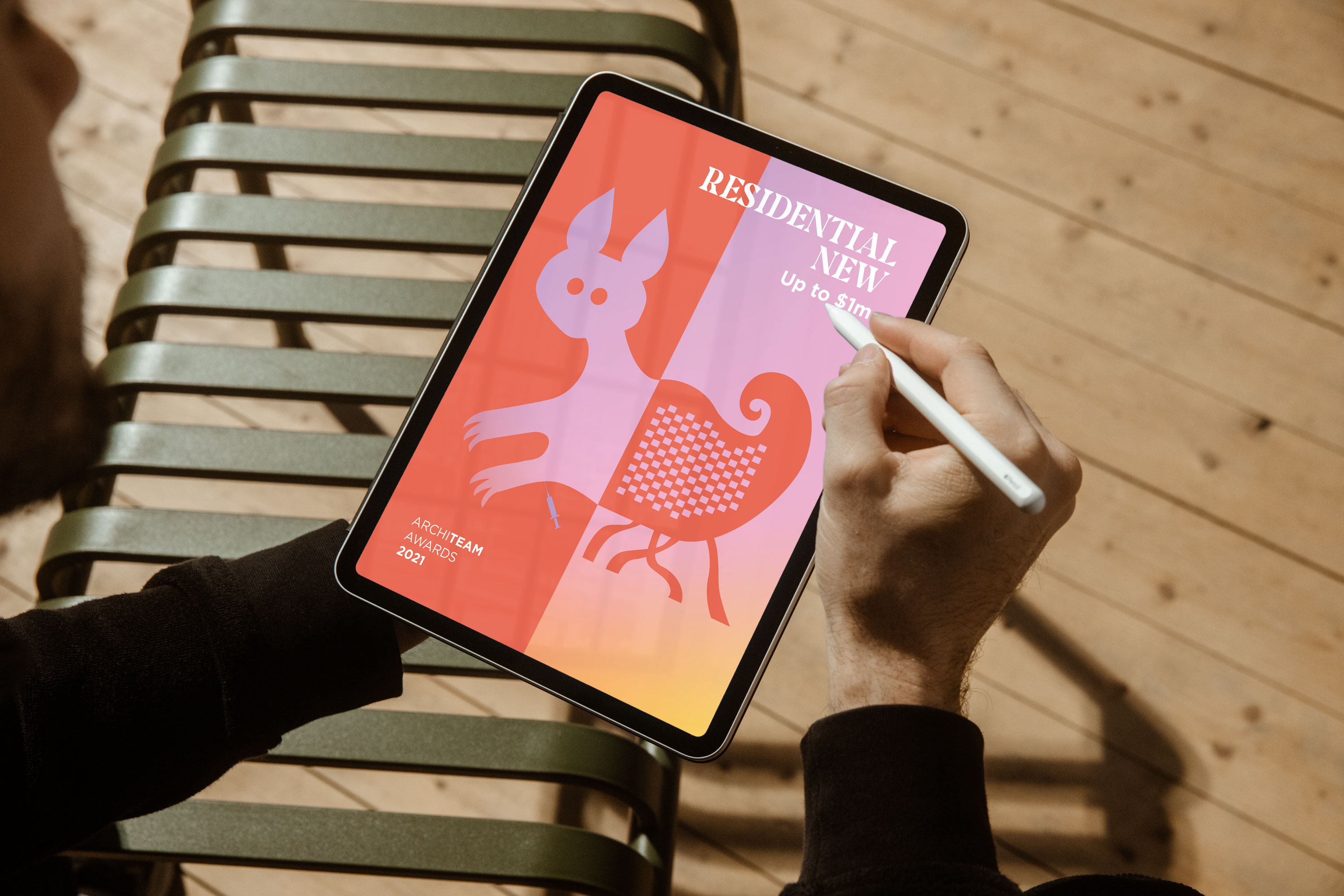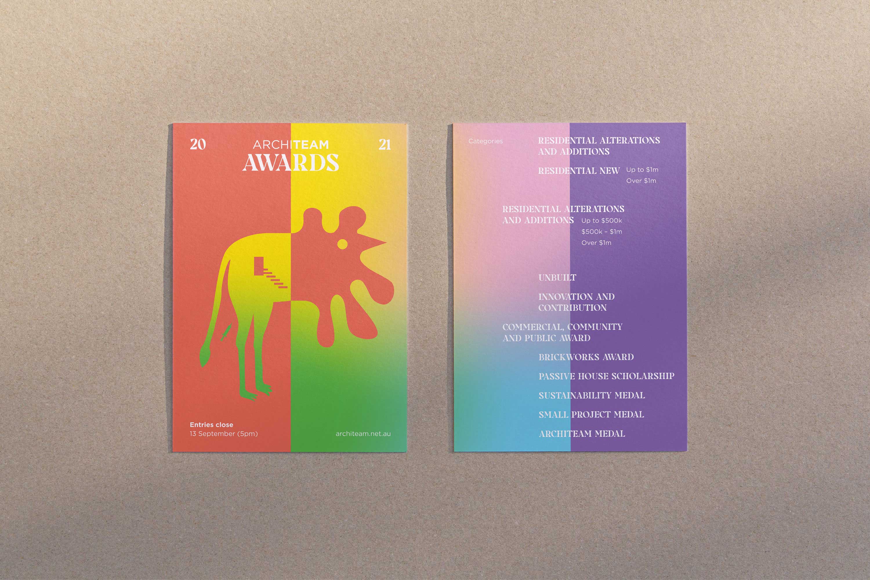 Dolphin/caterpillar. Rabbit/frog. Duck/turtle. Mythical fusions represent unexpected beauty through human intervention: how the most innovative architectural designs can emerge from unlikely combinations. The ArchiTeam Awards 2021 identity is a play on the largest category Architectural Alterations and Additions, with a nod to the pandemic. Each hybrid architectural beast is depicted “having their jab” in a link to the highly-charged COVID era. In glorious hypercolour, these beasts present as majestic and memorable, within an architectural branding landscape so often dominated by monochrome, rectilinear designs.
