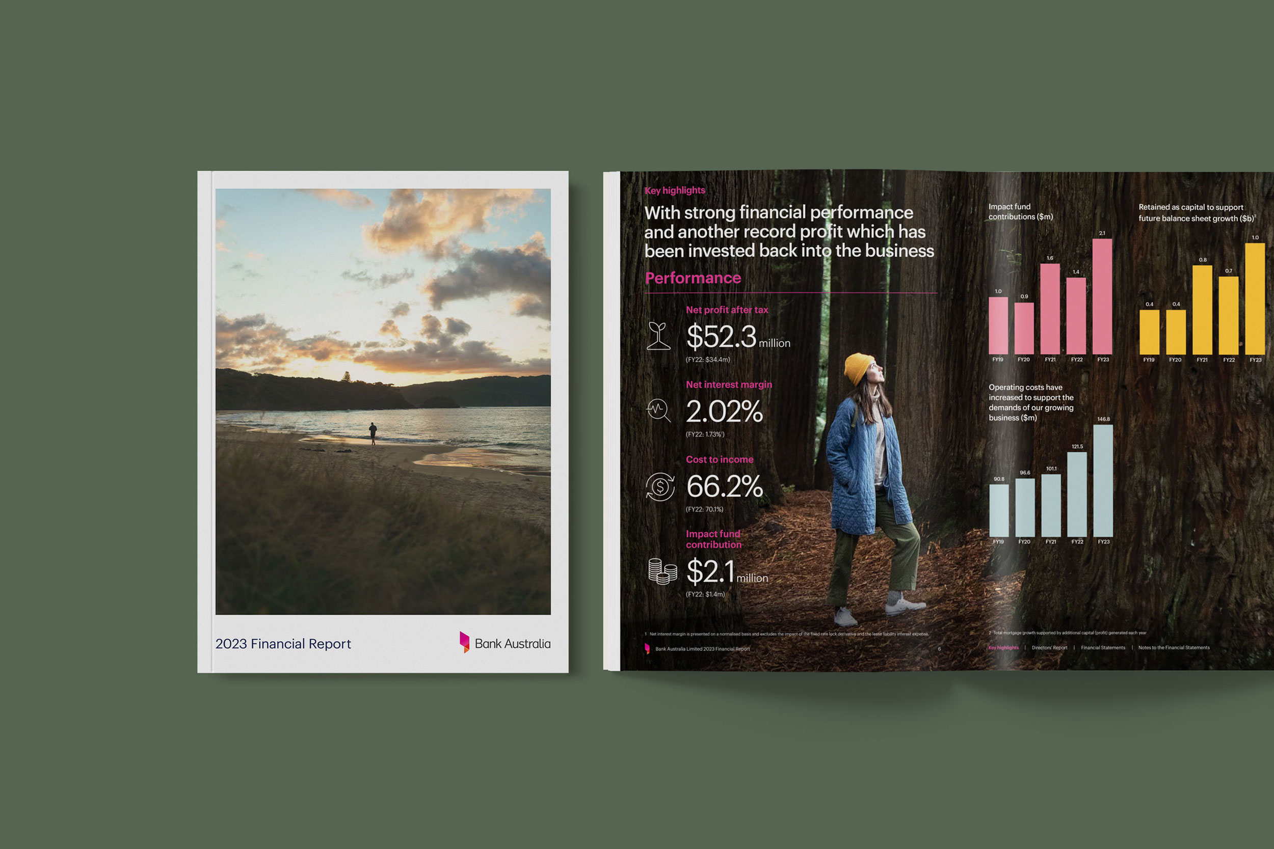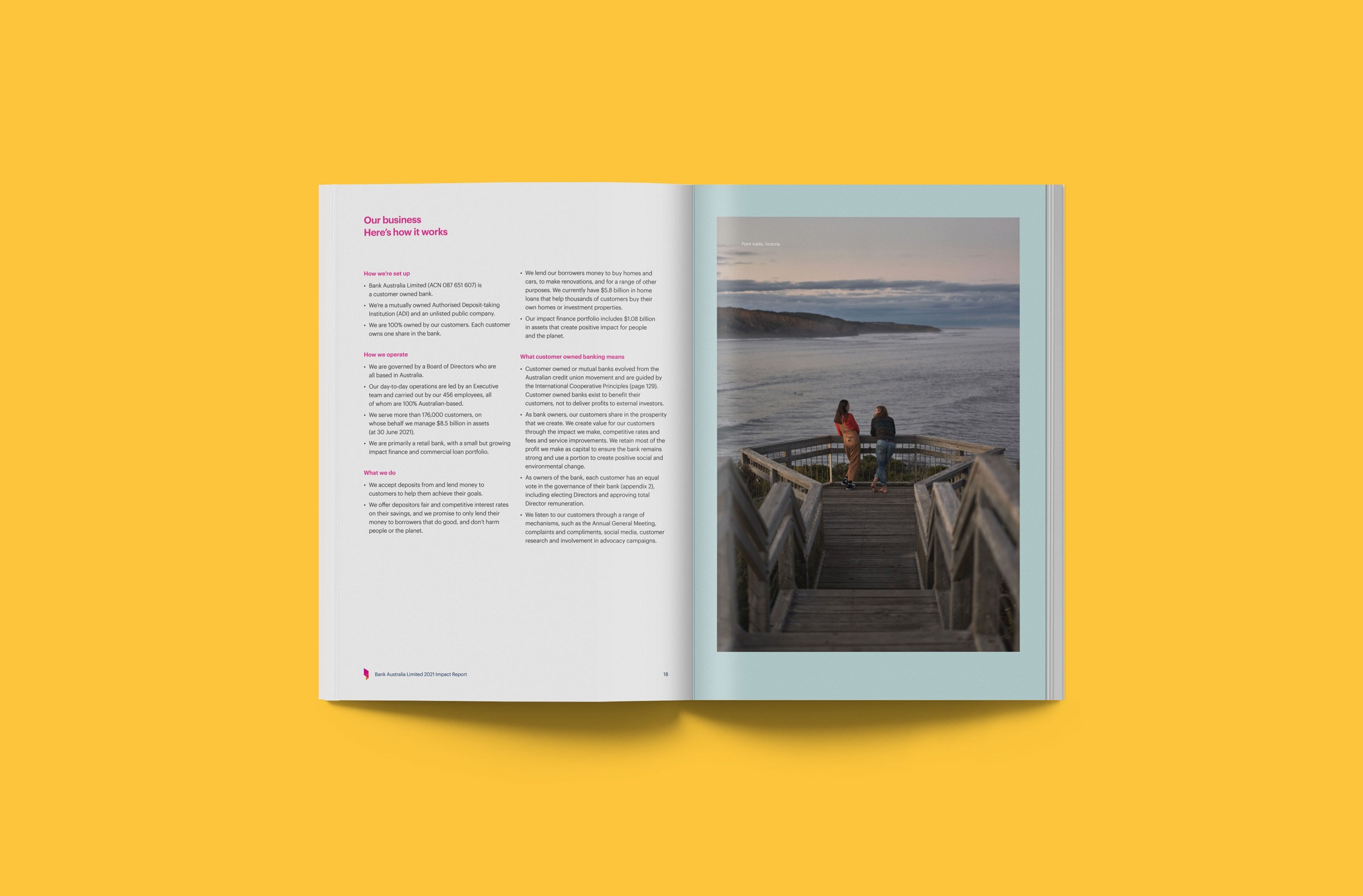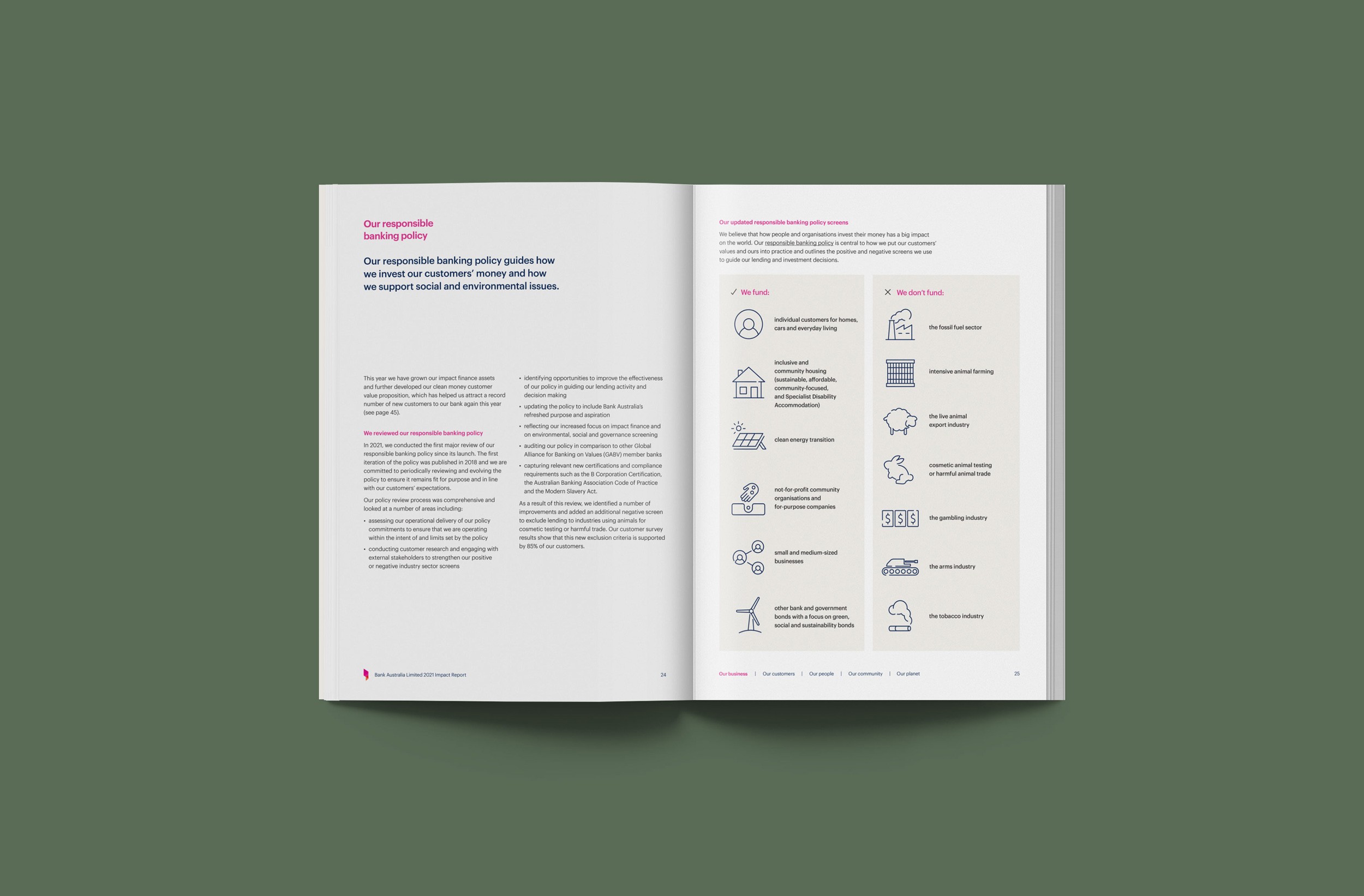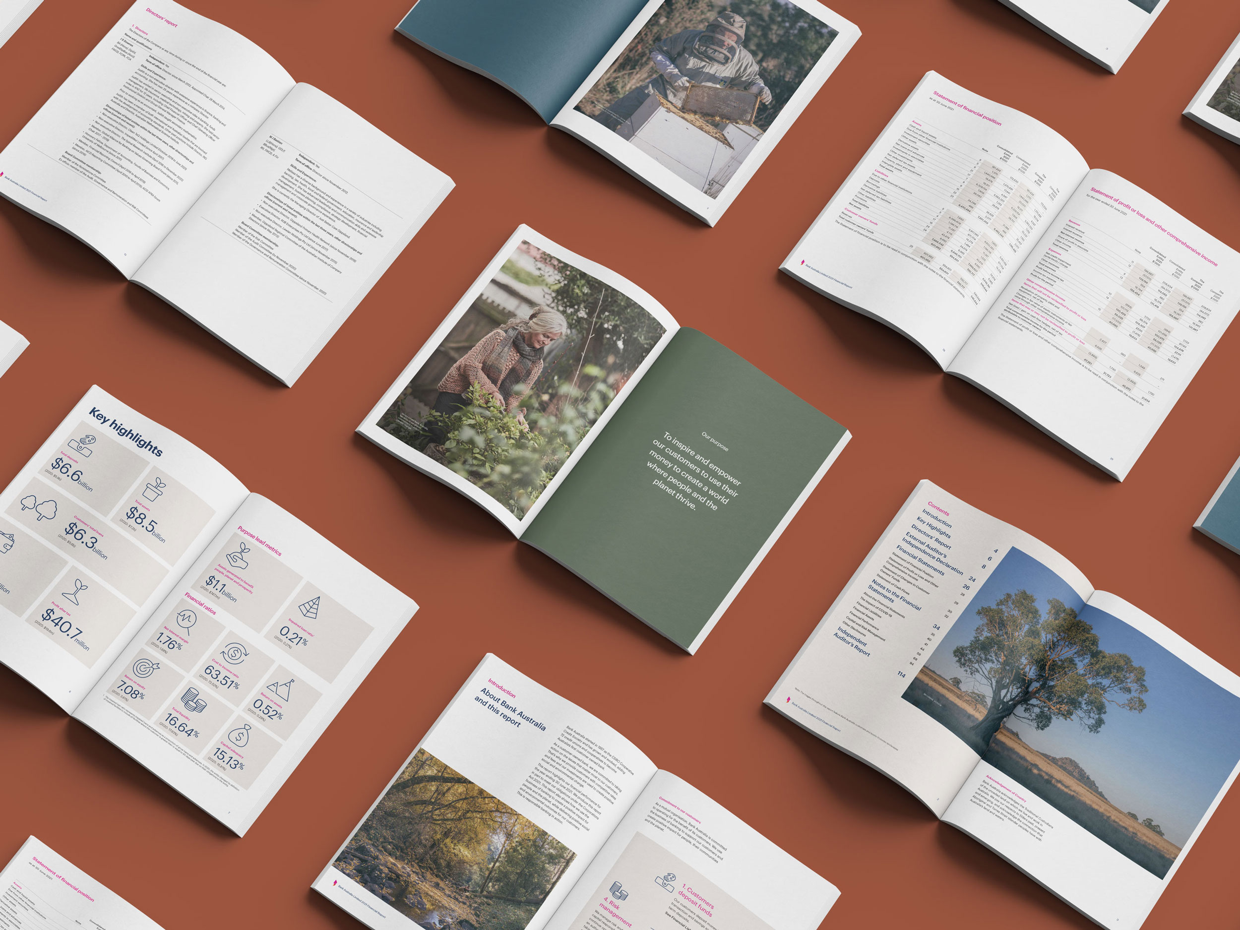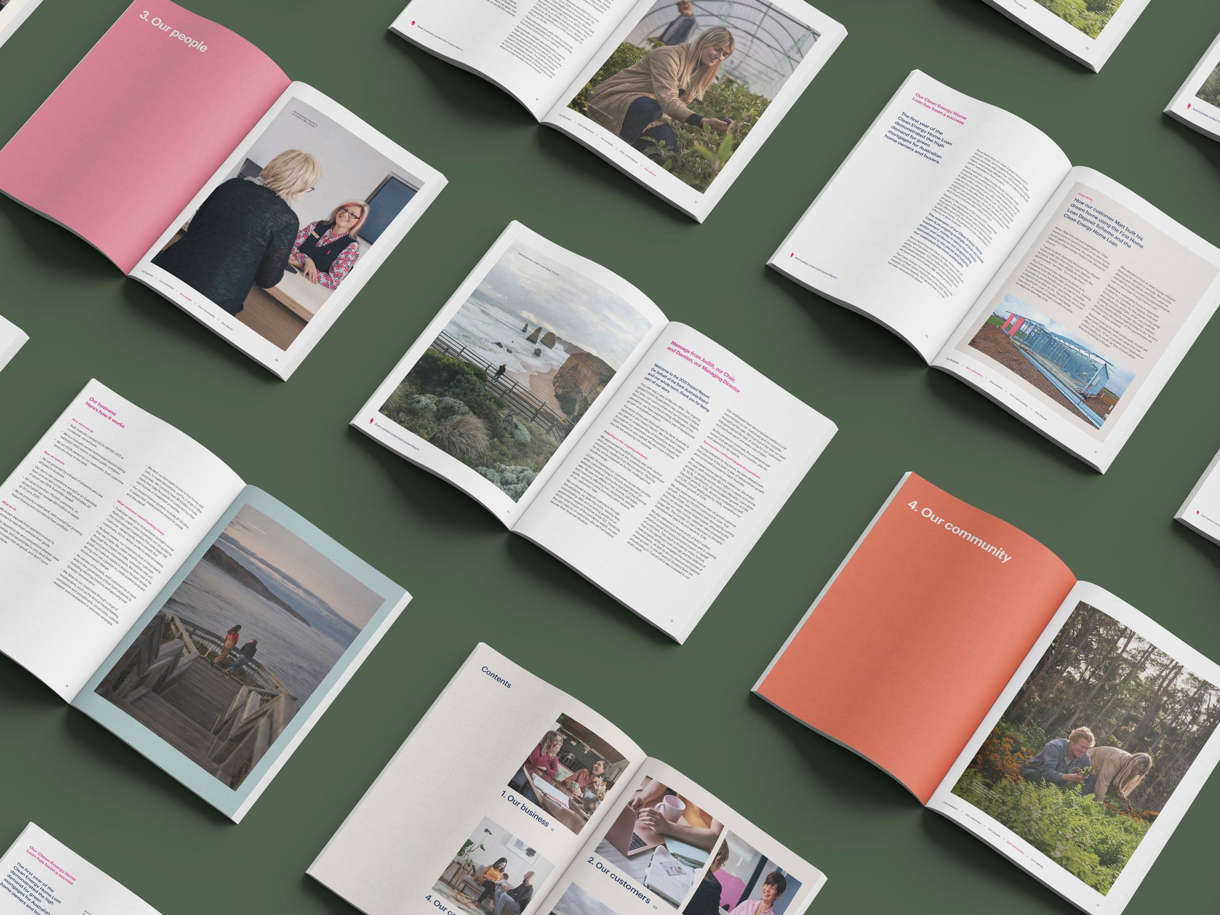 Design Democracy has produced nine annual report commissions for Bank Australia. As a certified B Corp and Australia’s first customer-owned bank, Bank Australia is committed to generating positive impacts for people and the planet. The Impact Reports continue the trend of acquitting the company’s ethical mission with simplicity and clarity. In line with brand colours, the document palette is simple and clean, emphasising transparency and accountability. Recent reports have been produced as fully accessible digital documents for readers who are visually impaired or otherwise print-disabled.