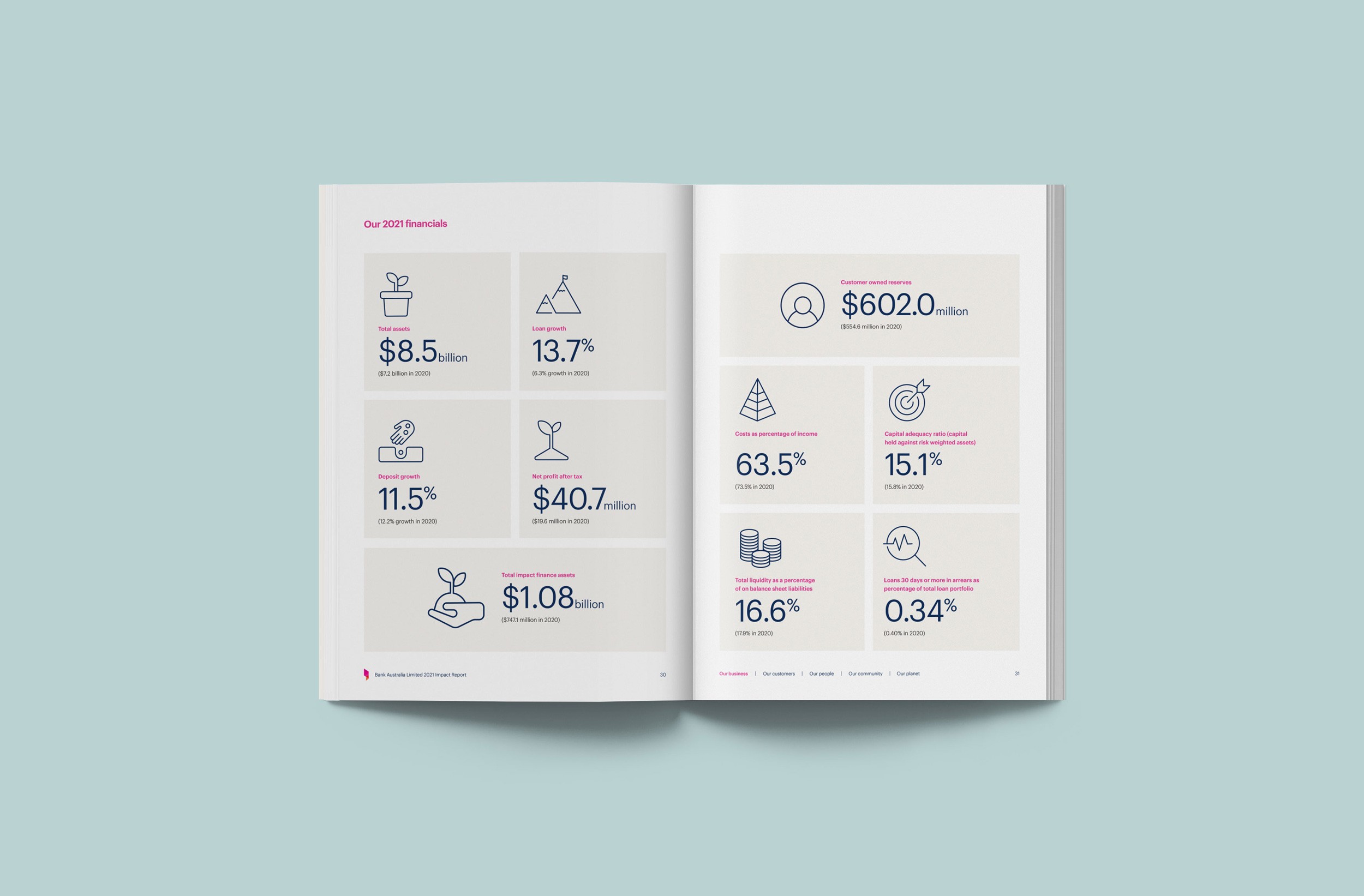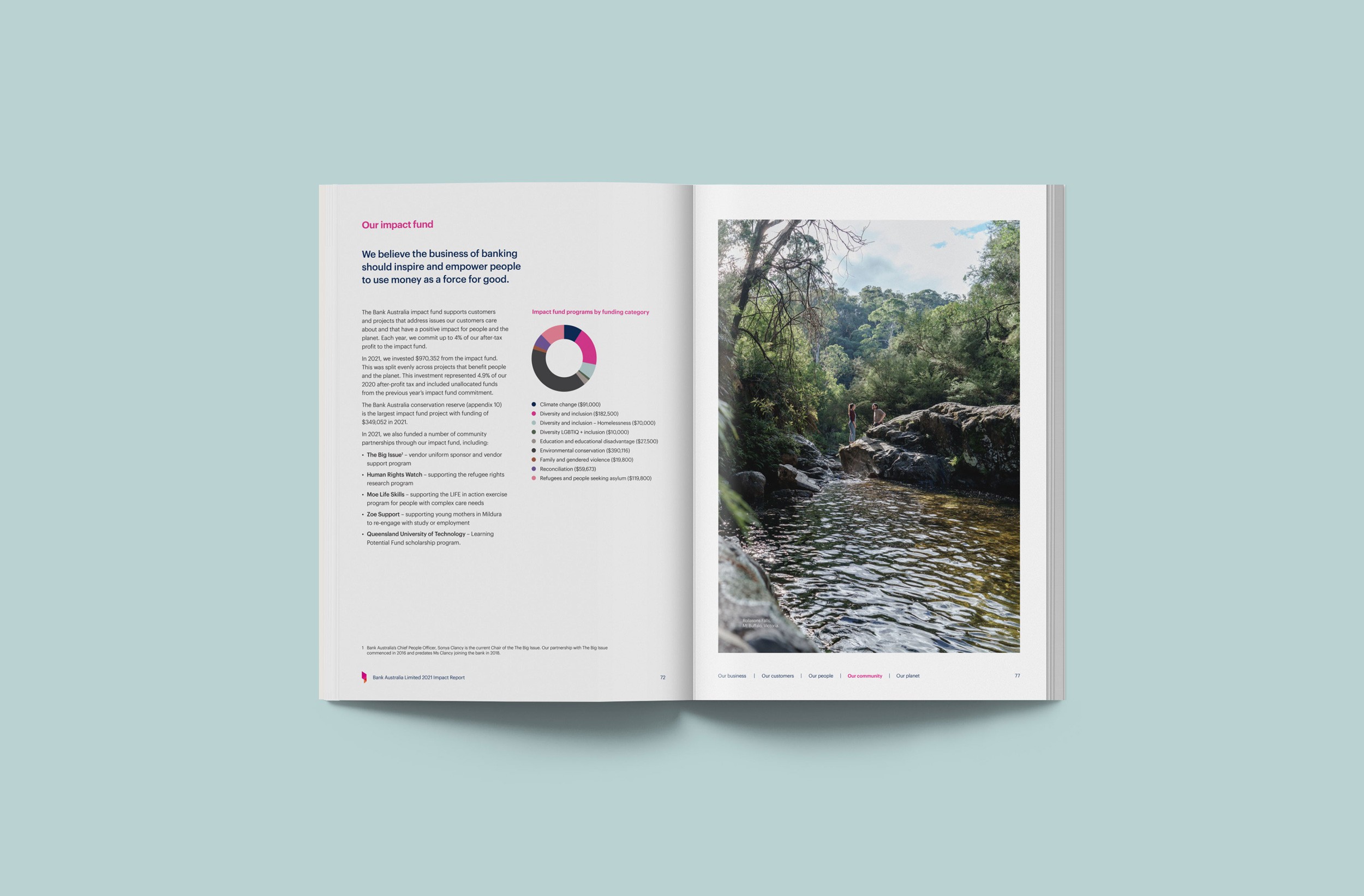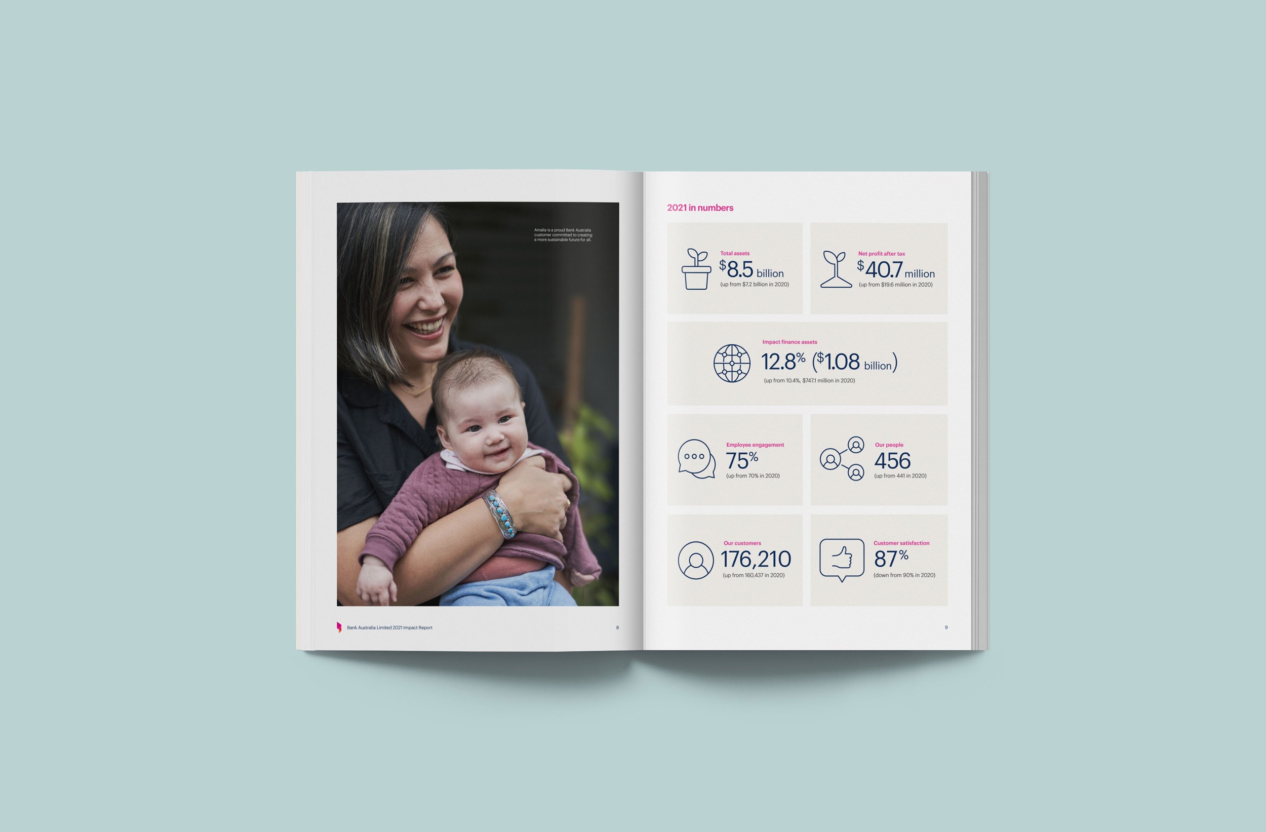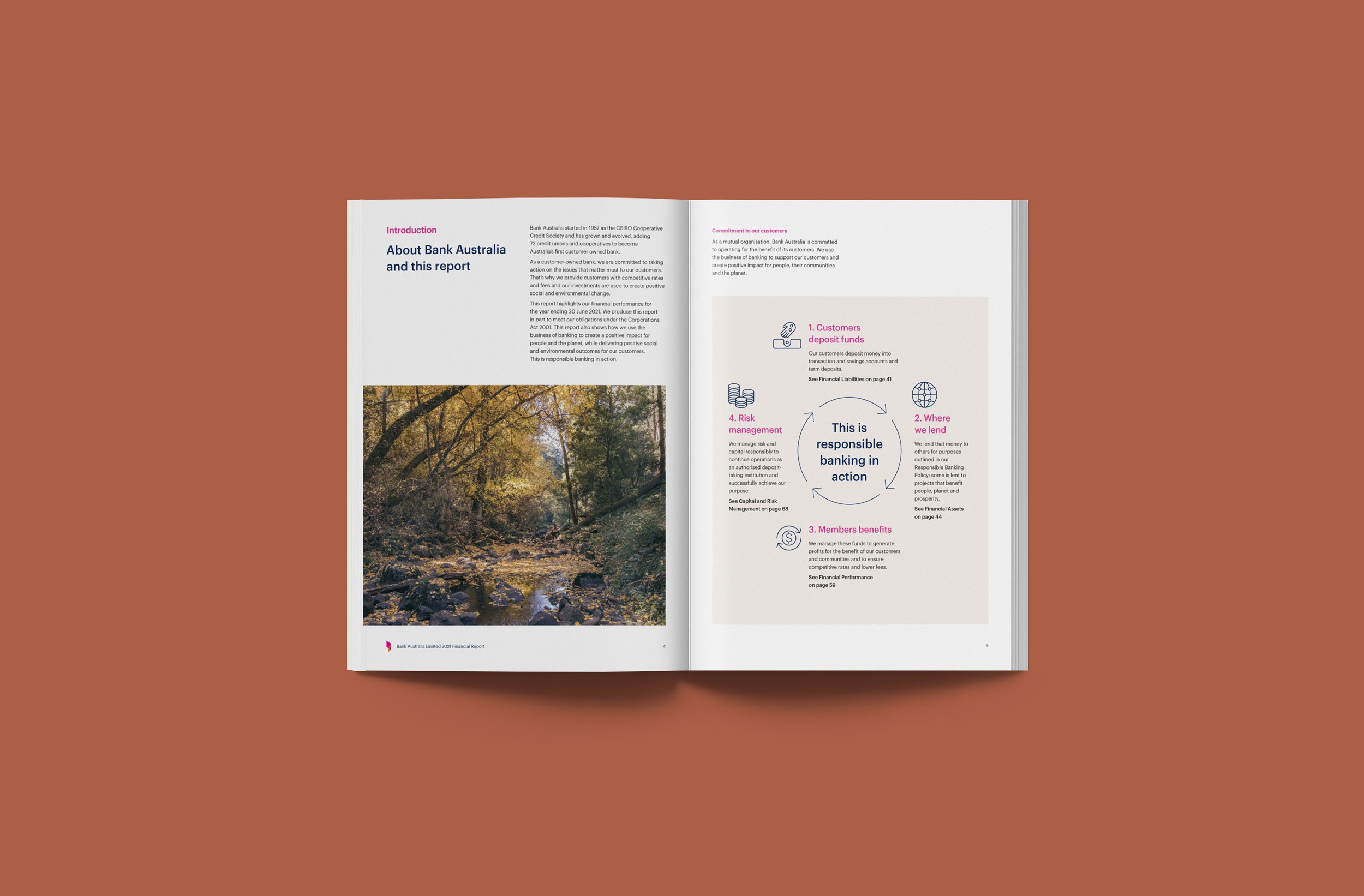 Design Democracy has produced nine annual report commissions for Bank Australia. As a certified B Corp and Australia’s first customer-owned bank, Bank Australia is committed to generating positive impacts for people and the planet. The Impact Reports continue the trend of acquitting the company’s ethical mission with simplicity and clarity. In line with brand colours, the document palette is simple and clean, emphasising transparency and accountability. Recent reports have been produced as fully accessible digital documents for readers who are visually impaired or otherwise print-disabled.