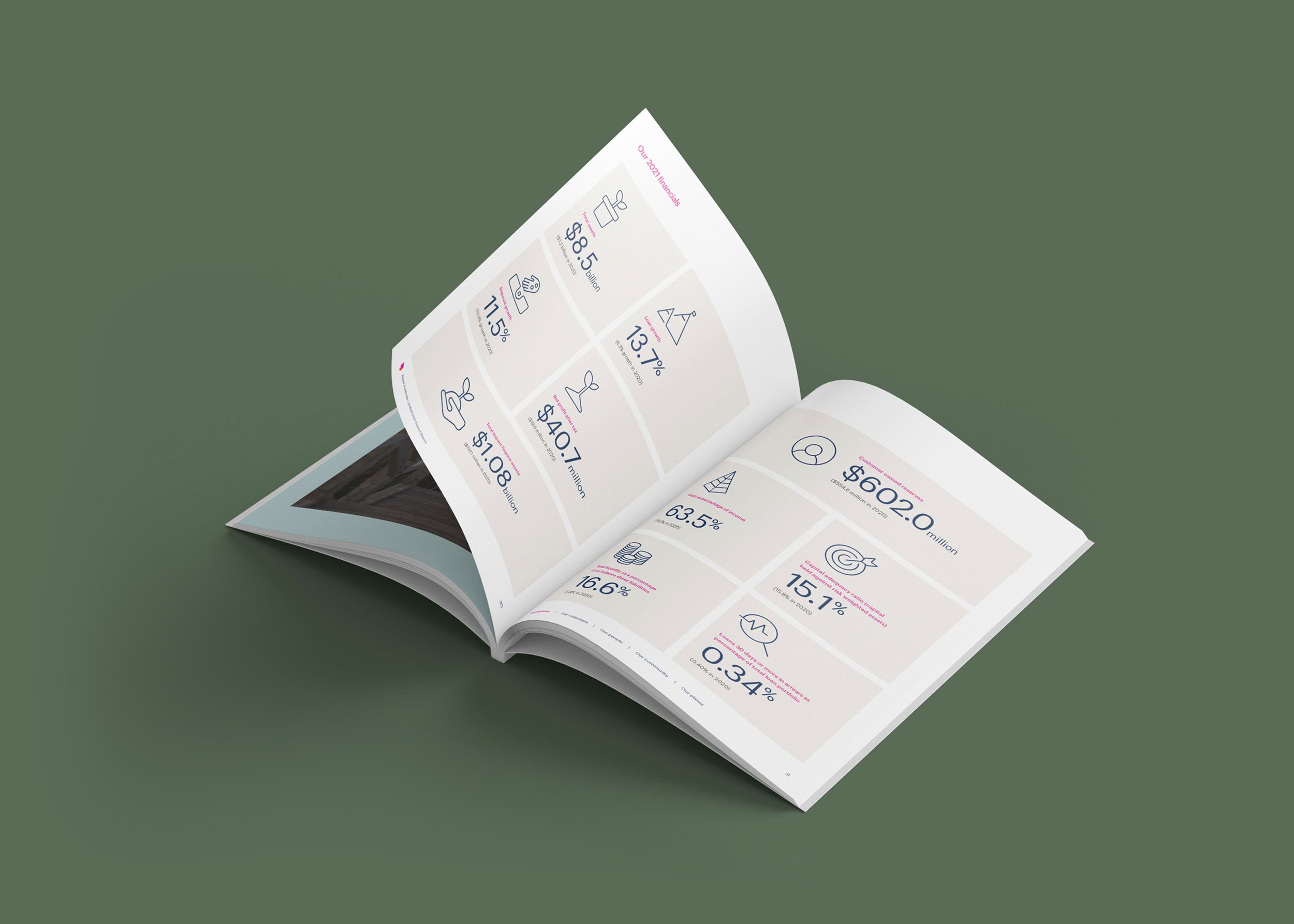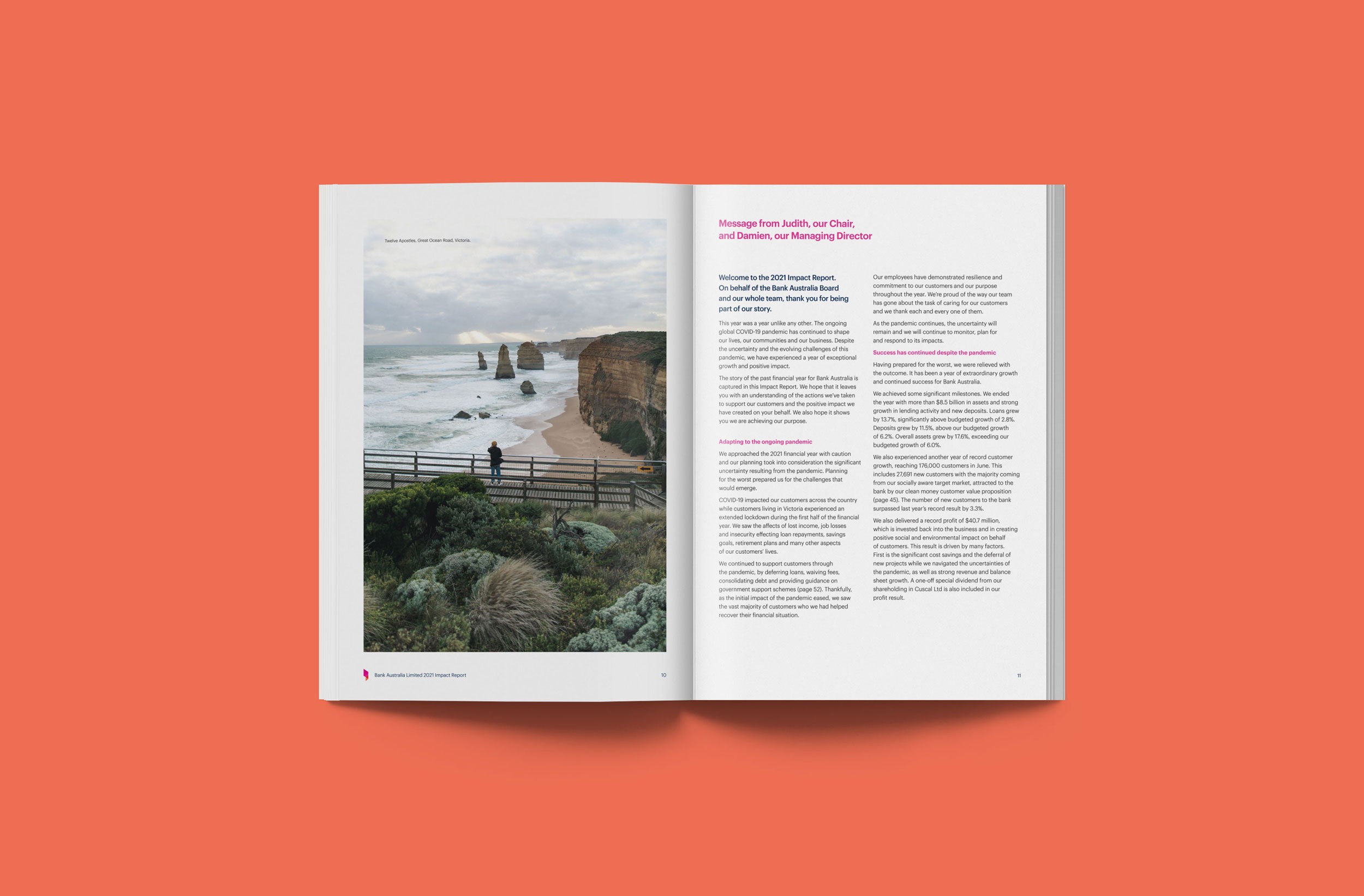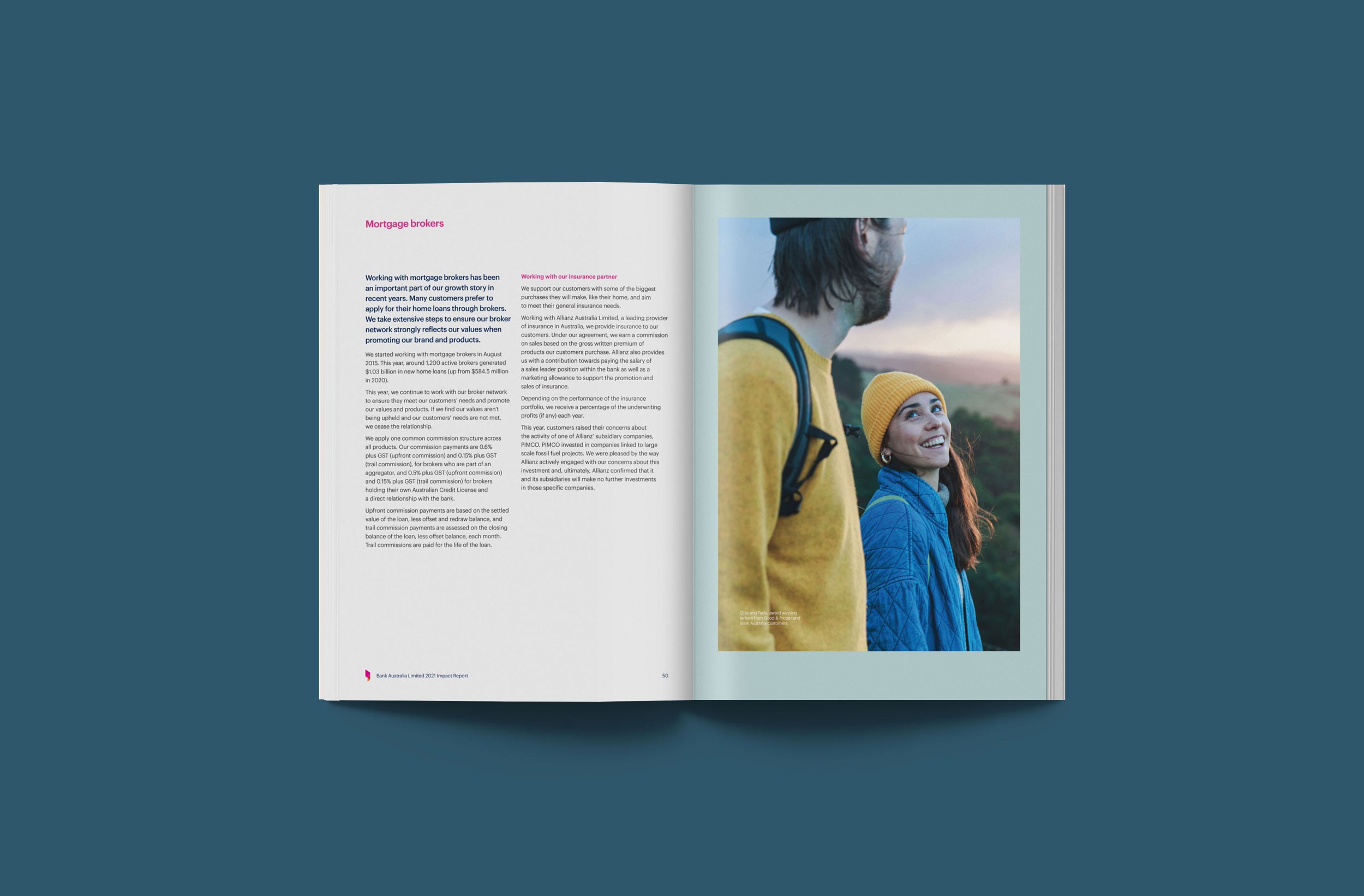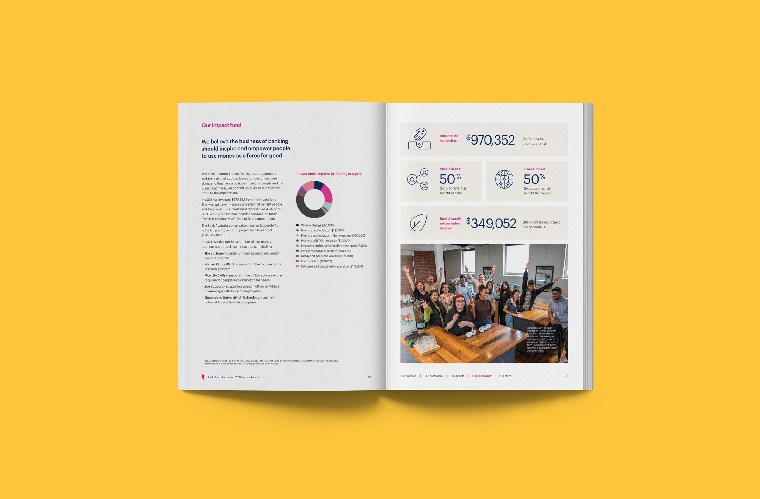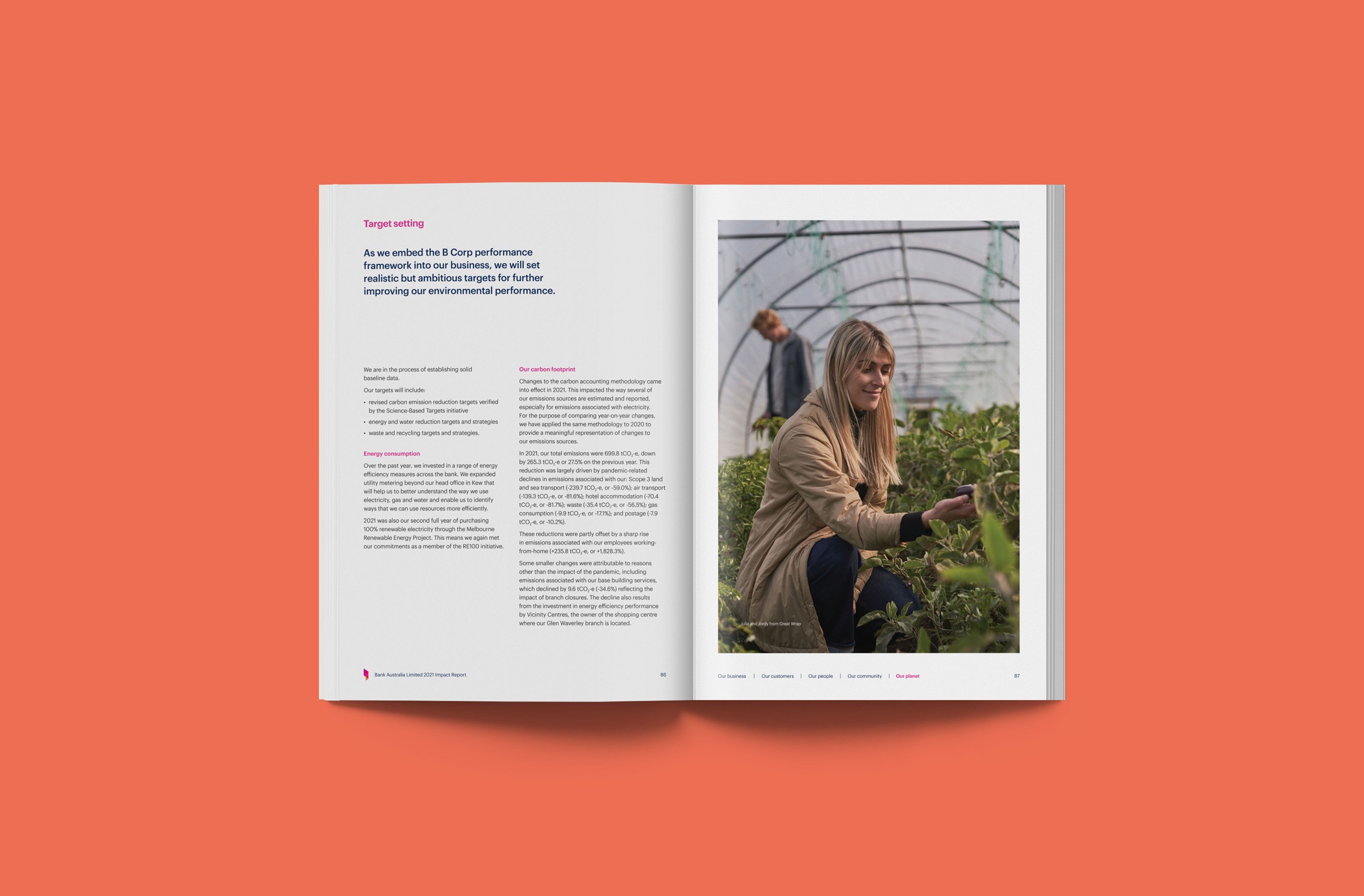 Design Democracy has produced nine annual report commissions for Bank Australia. As a certified B Corp and Australia’s first customer-owned bank, Bank Australia is committed to generating positive impacts for people and the planet. The Impact Reports continue the trend of acquitting the company’s ethical mission with simplicity and clarity. In line with brand colours, the document palette is simple and clean, emphasising transparency and accountability. Recent reports have been produced as fully accessible digital documents for readers who are visually impaired or otherwise print-disabled.