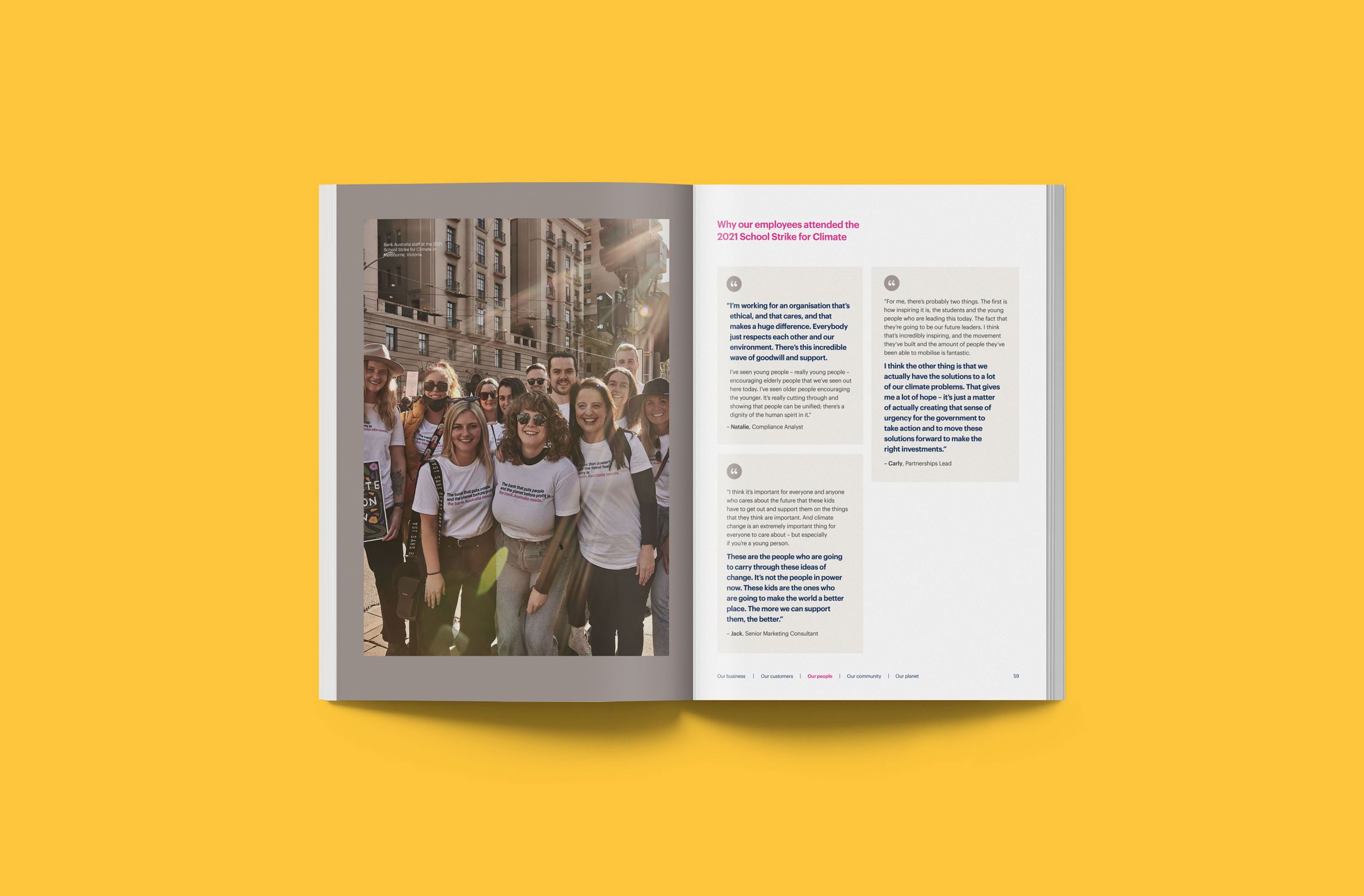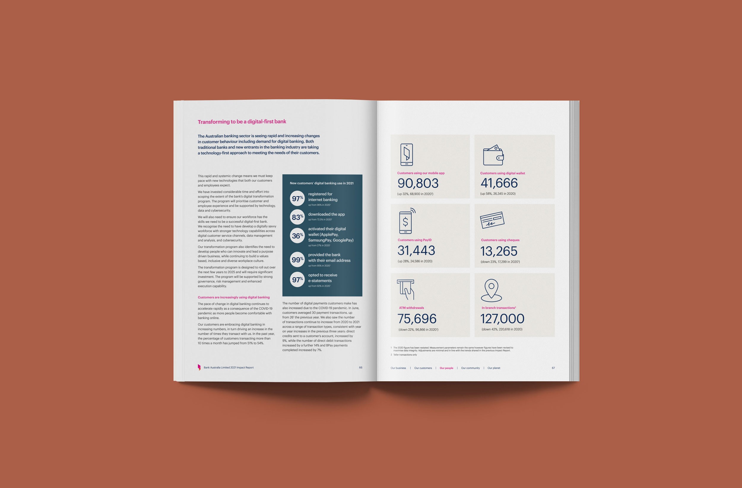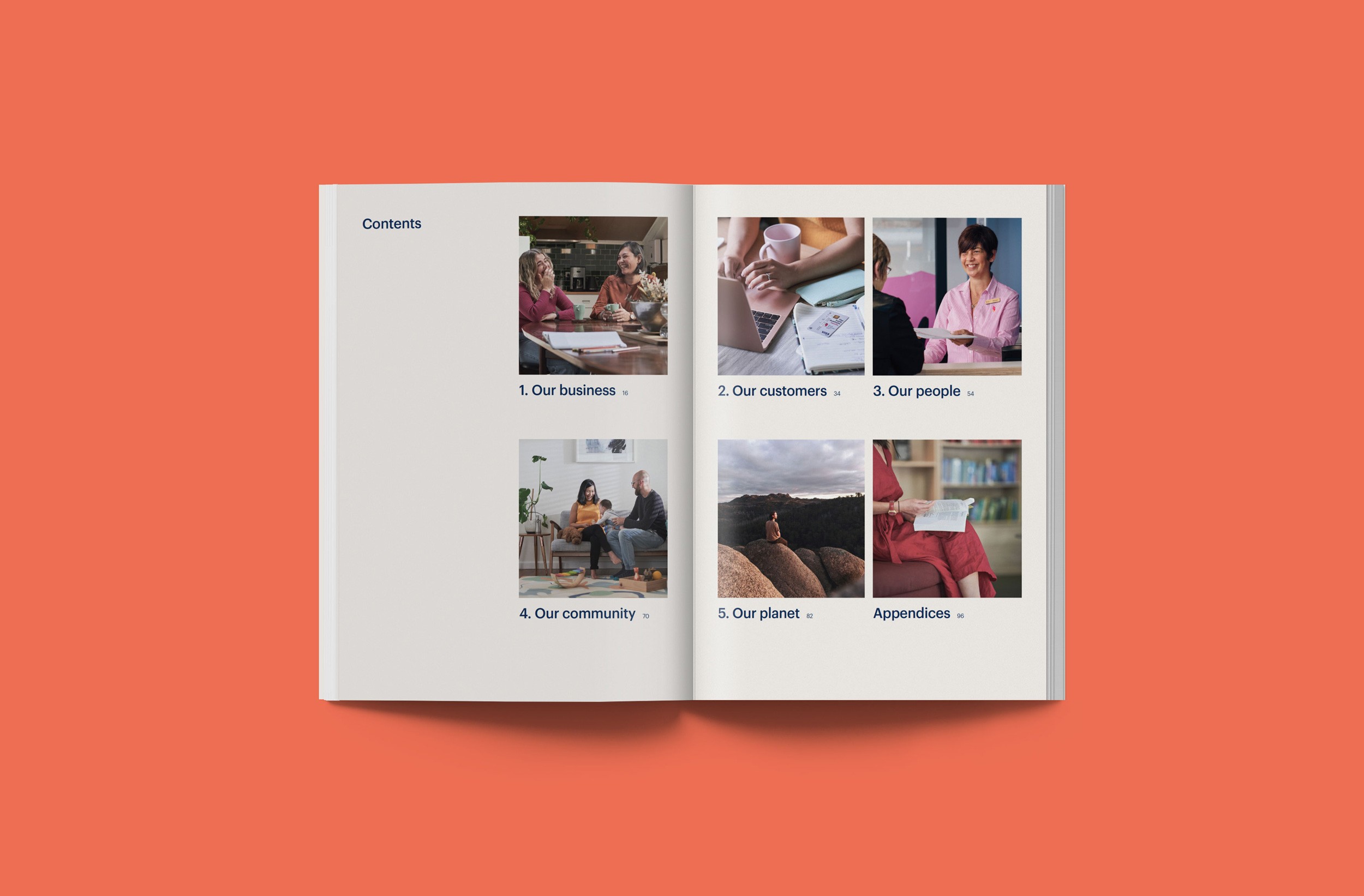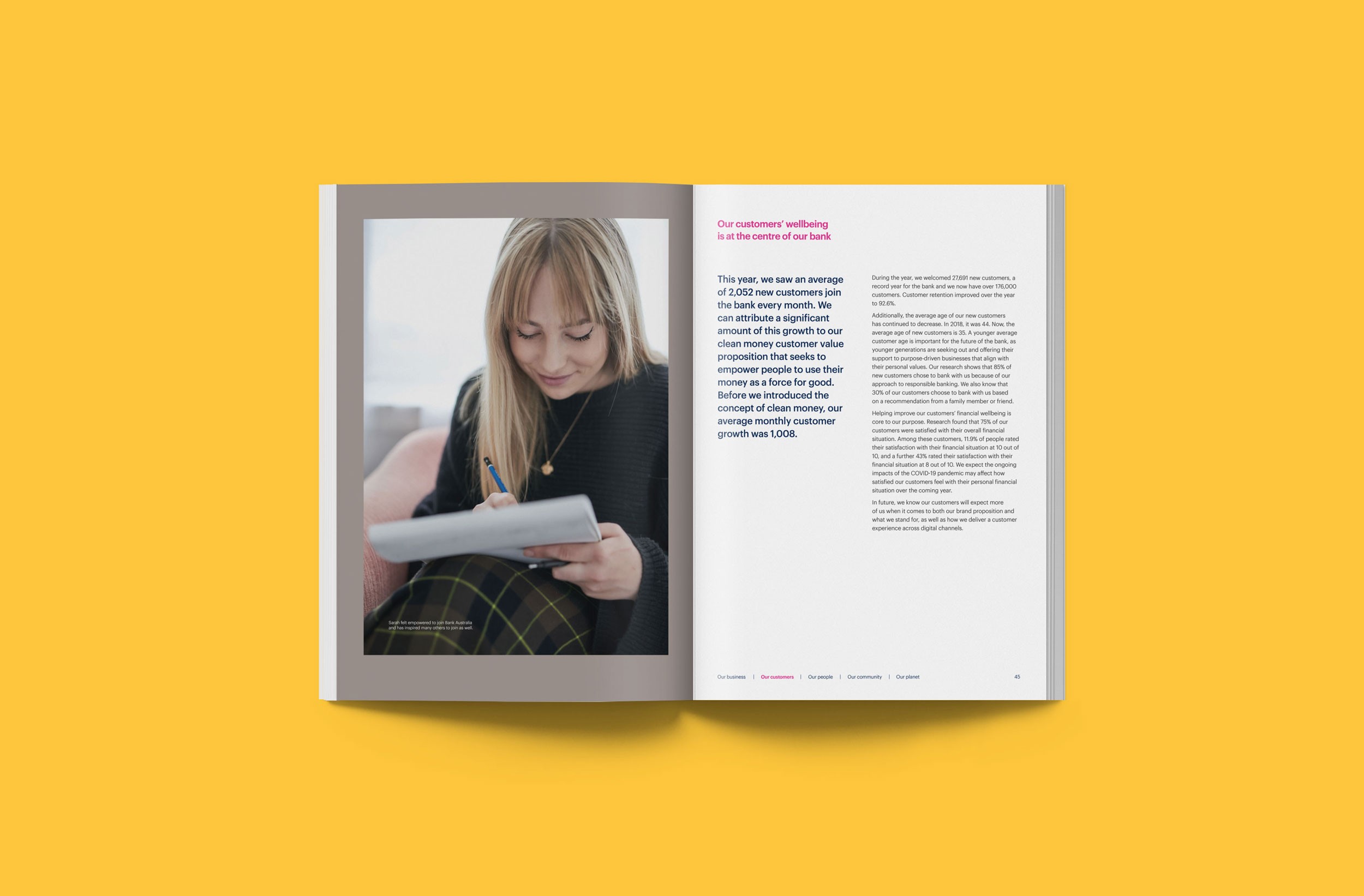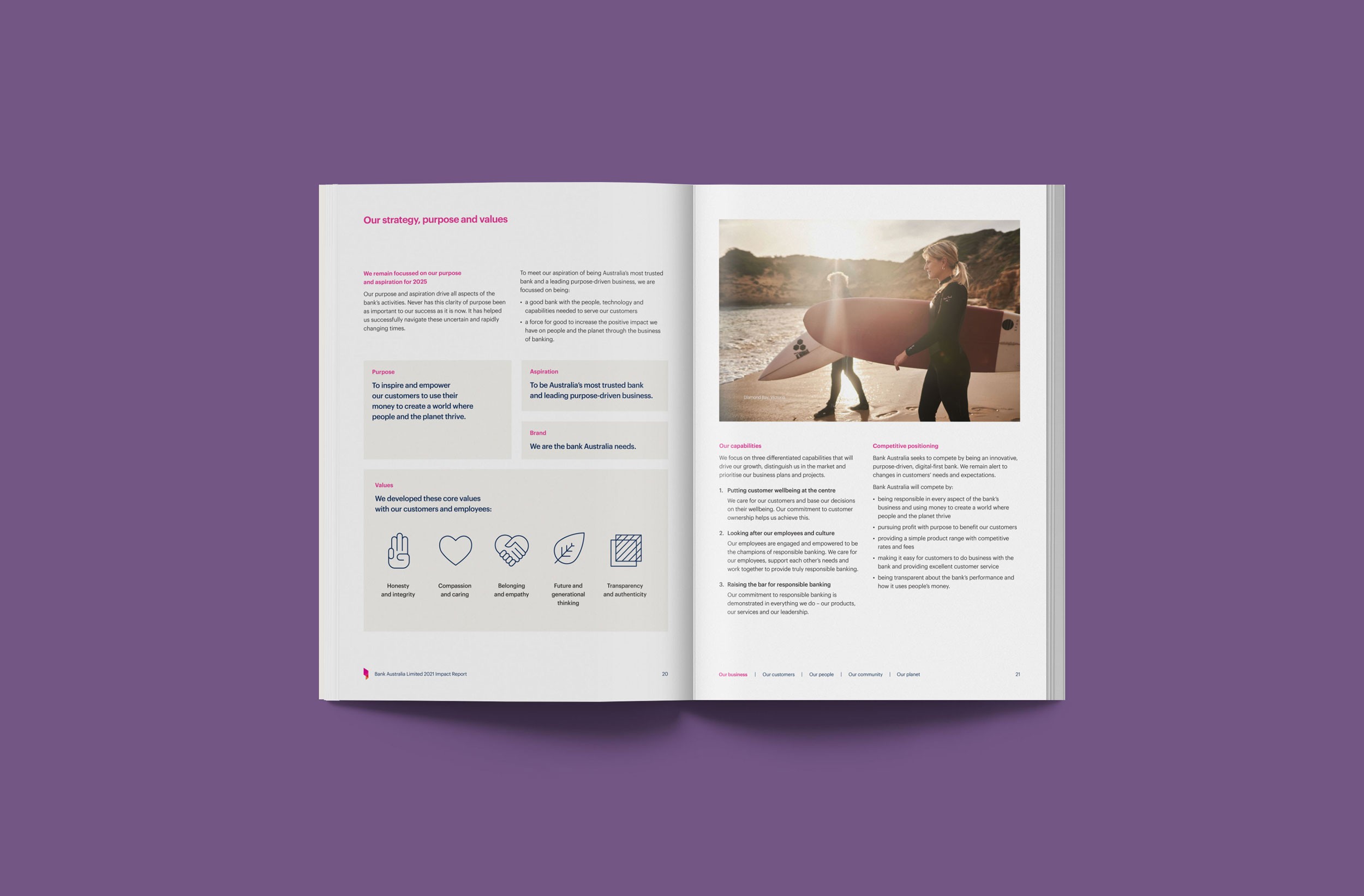 Design Democracy has produced nine annual report commissions for Bank Australia. As a certified B Corp and Australia’s first customer-owned bank, Bank Australia is committed to generating positive impacts for people and the planet. The Impact Reports continue the trend of acquitting the company’s ethical mission with simplicity and clarity. In line with brand colours, the document palette is simple and clean, emphasising transparency and accountability. Recent reports have been produced as fully accessible digital documents for readers who are visually impaired or otherwise print-disabled.