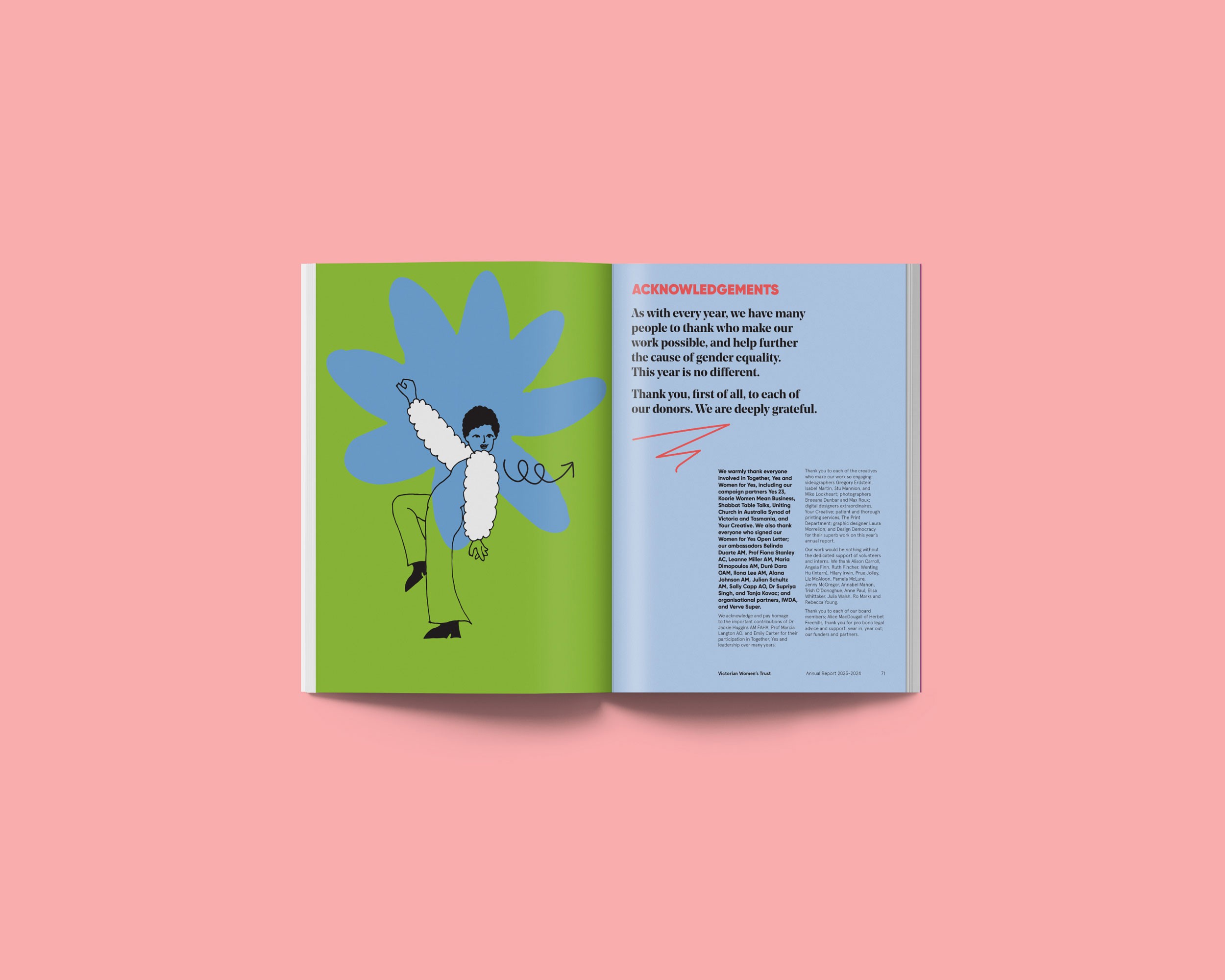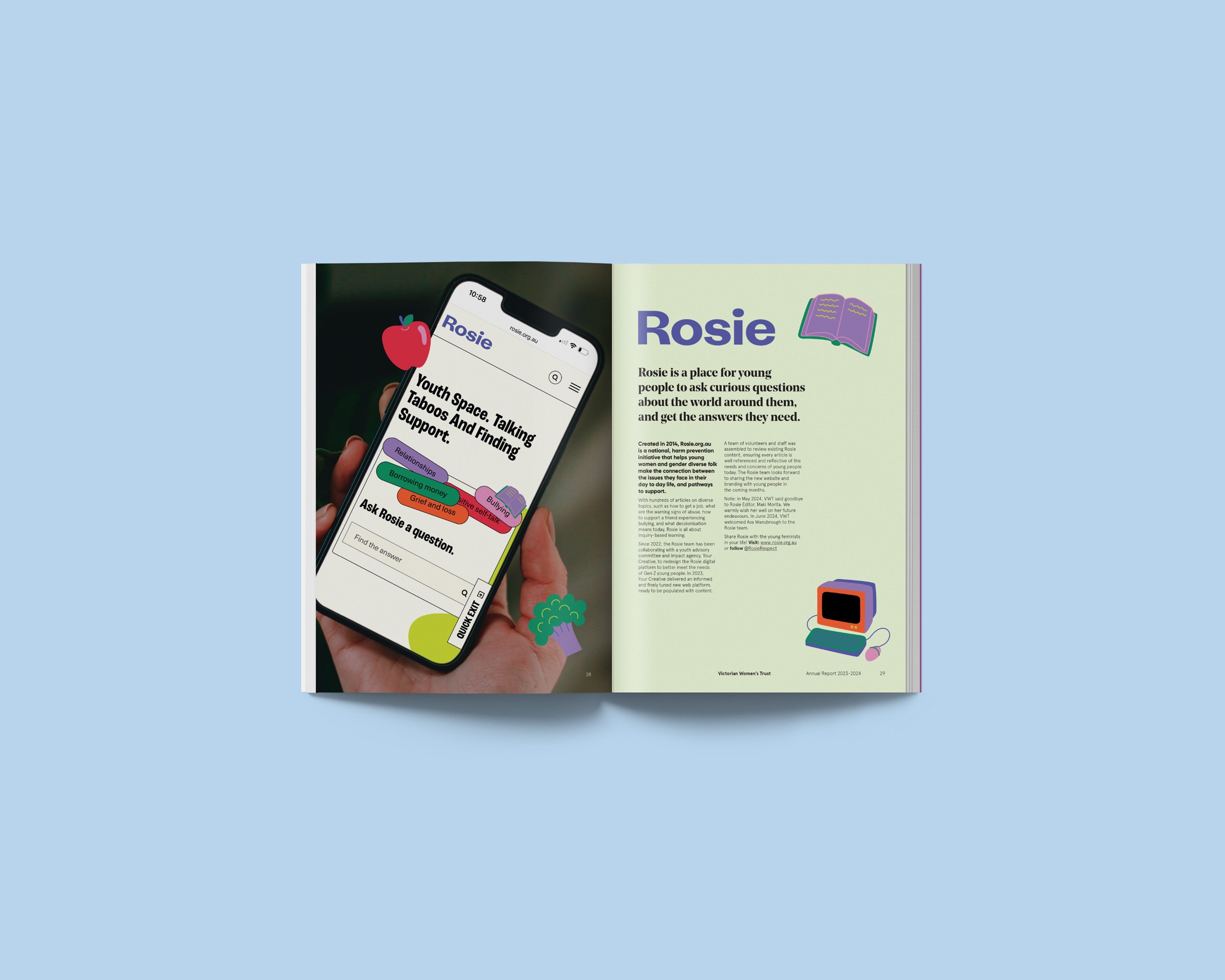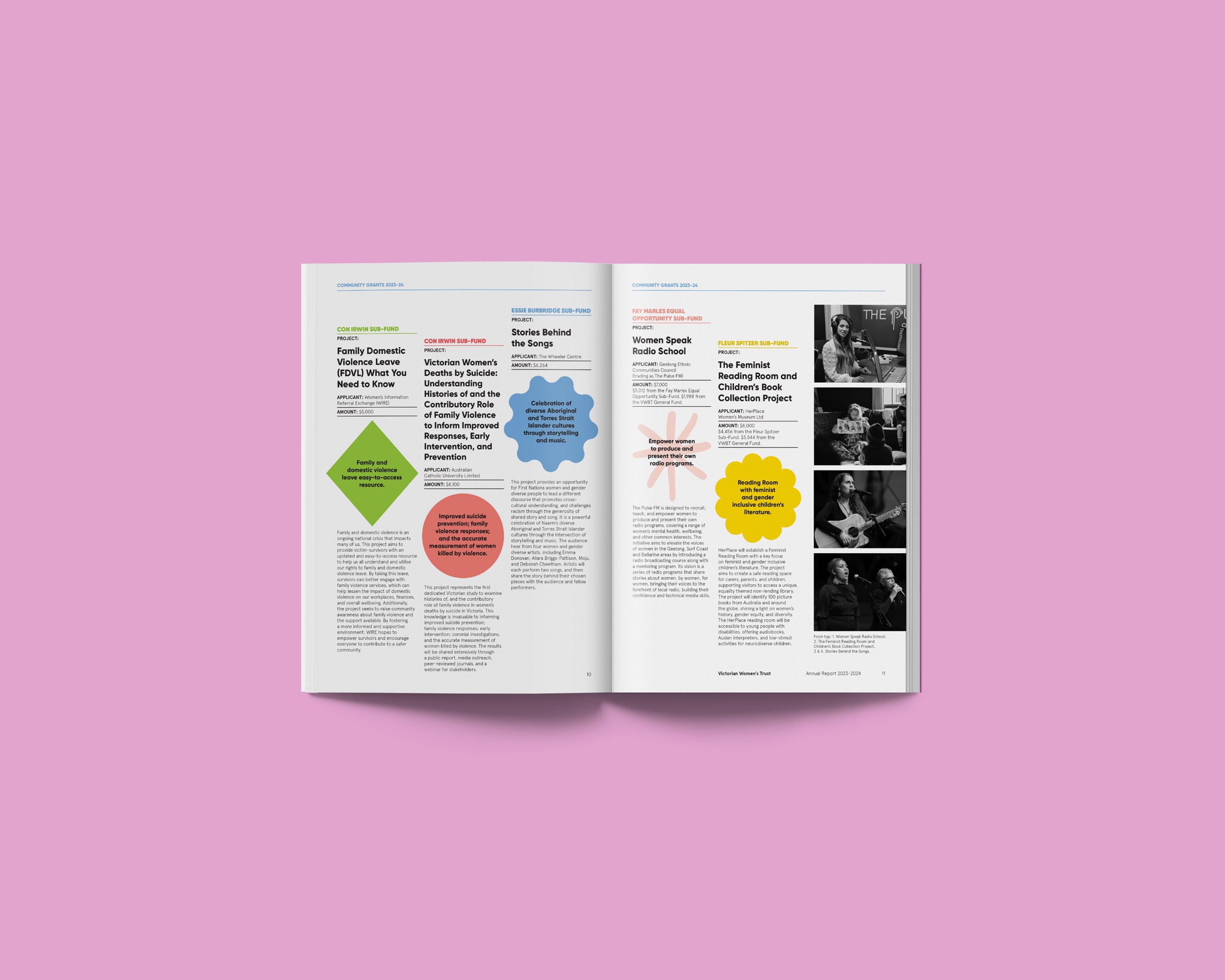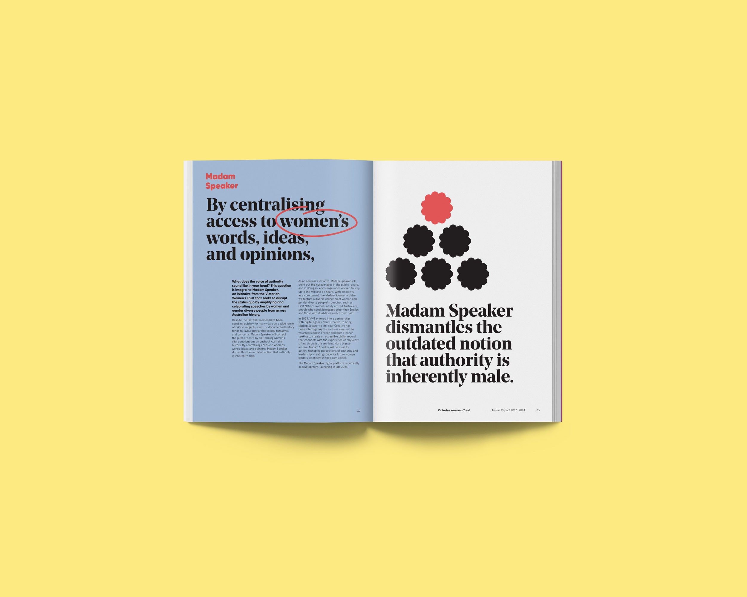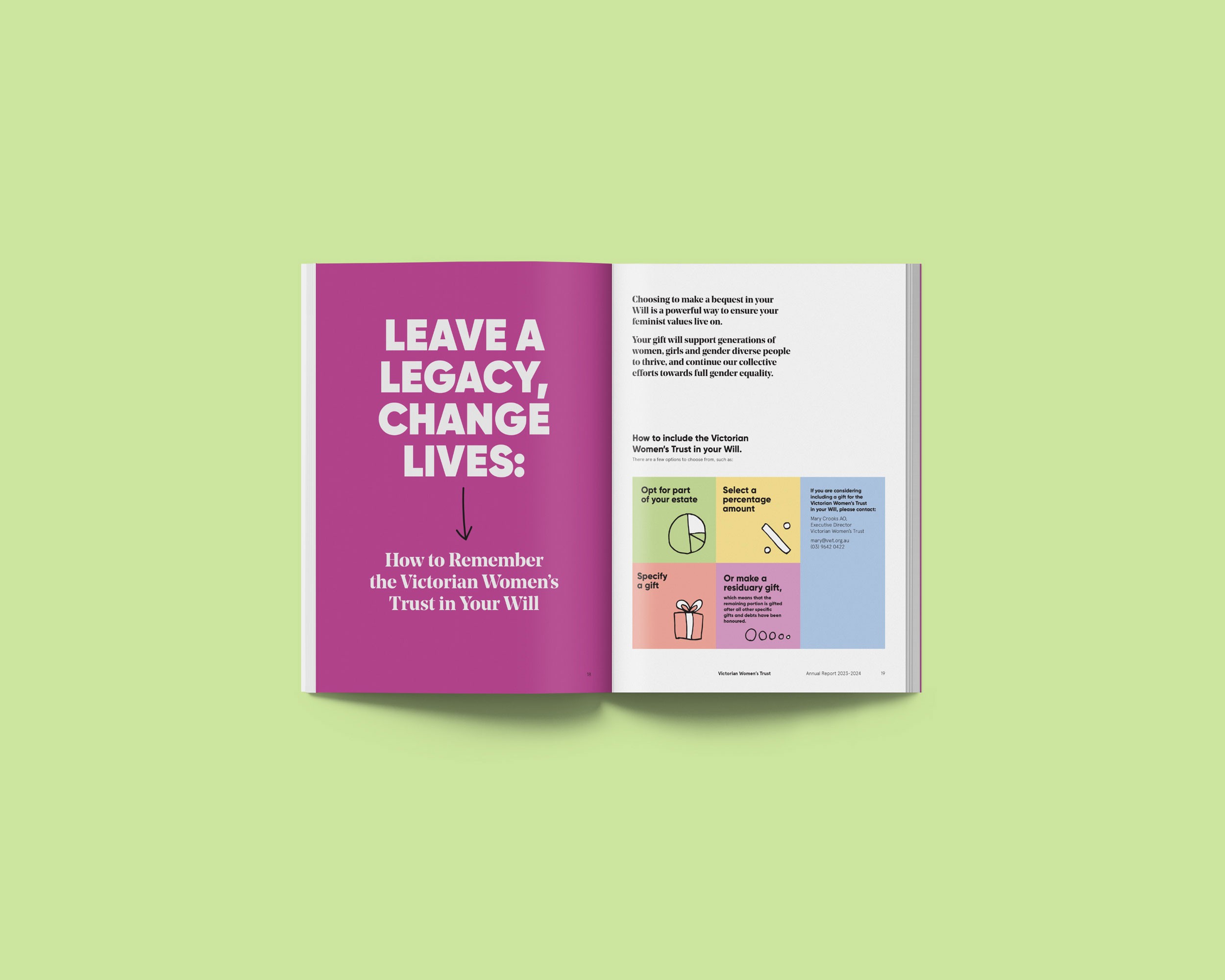 For nearly four decades, the Victorian Women's Trust has been an unwavering advocate for the rights of women, girls, and gender diverse people — an independent feminist organisation pressing for genuine, people-led change. When the time came to refresh their visual identity and annual report, it was this mission that guided every decision.