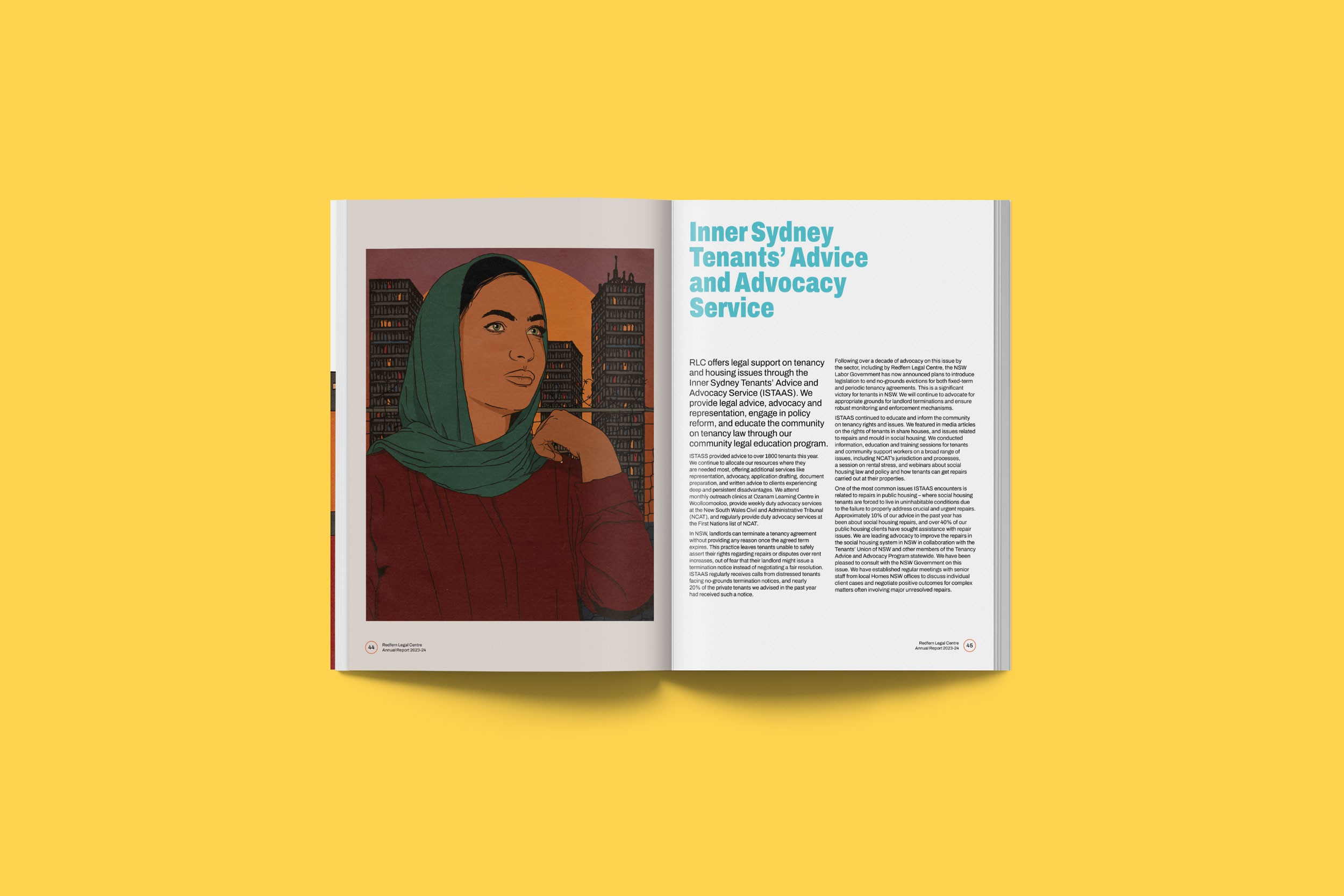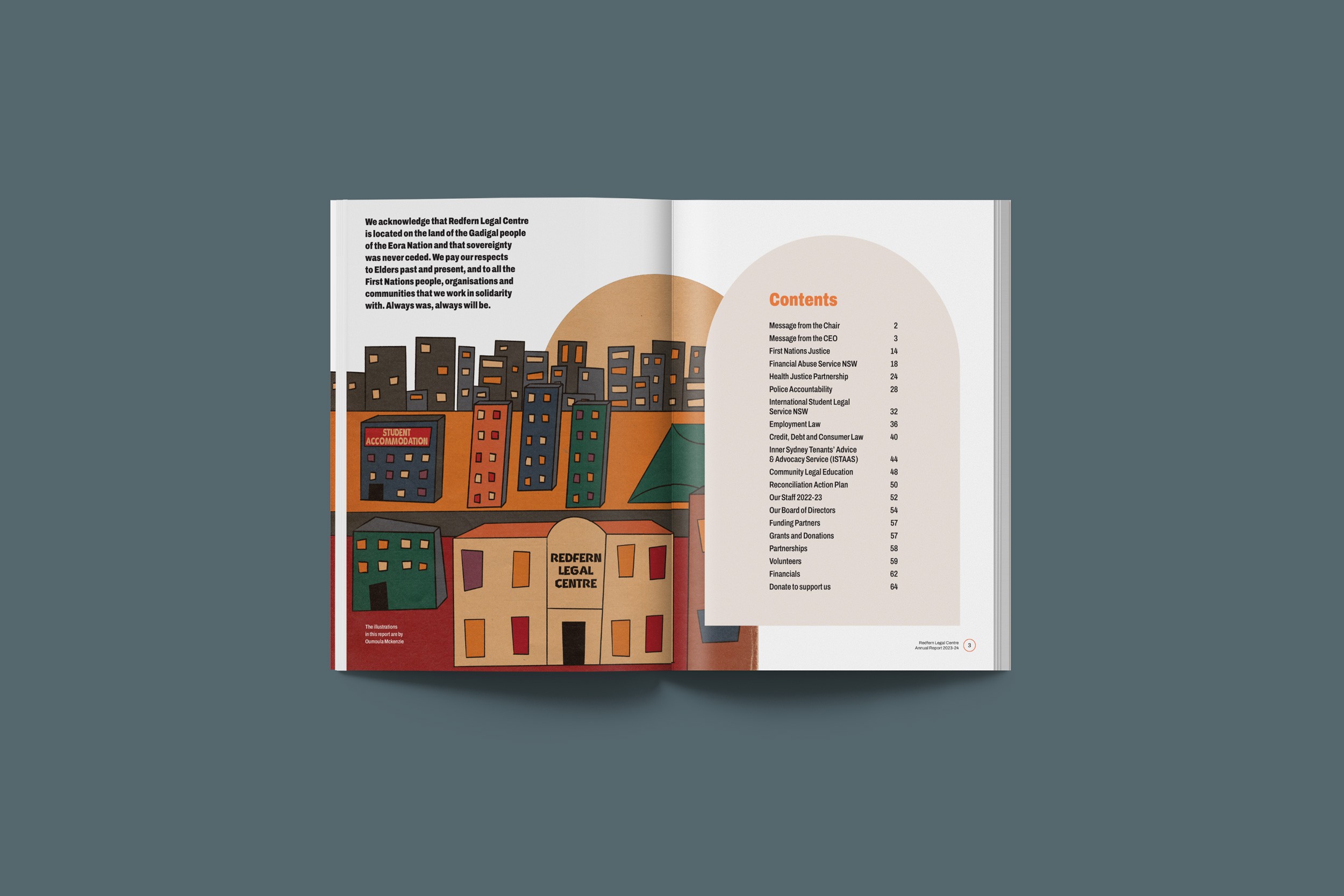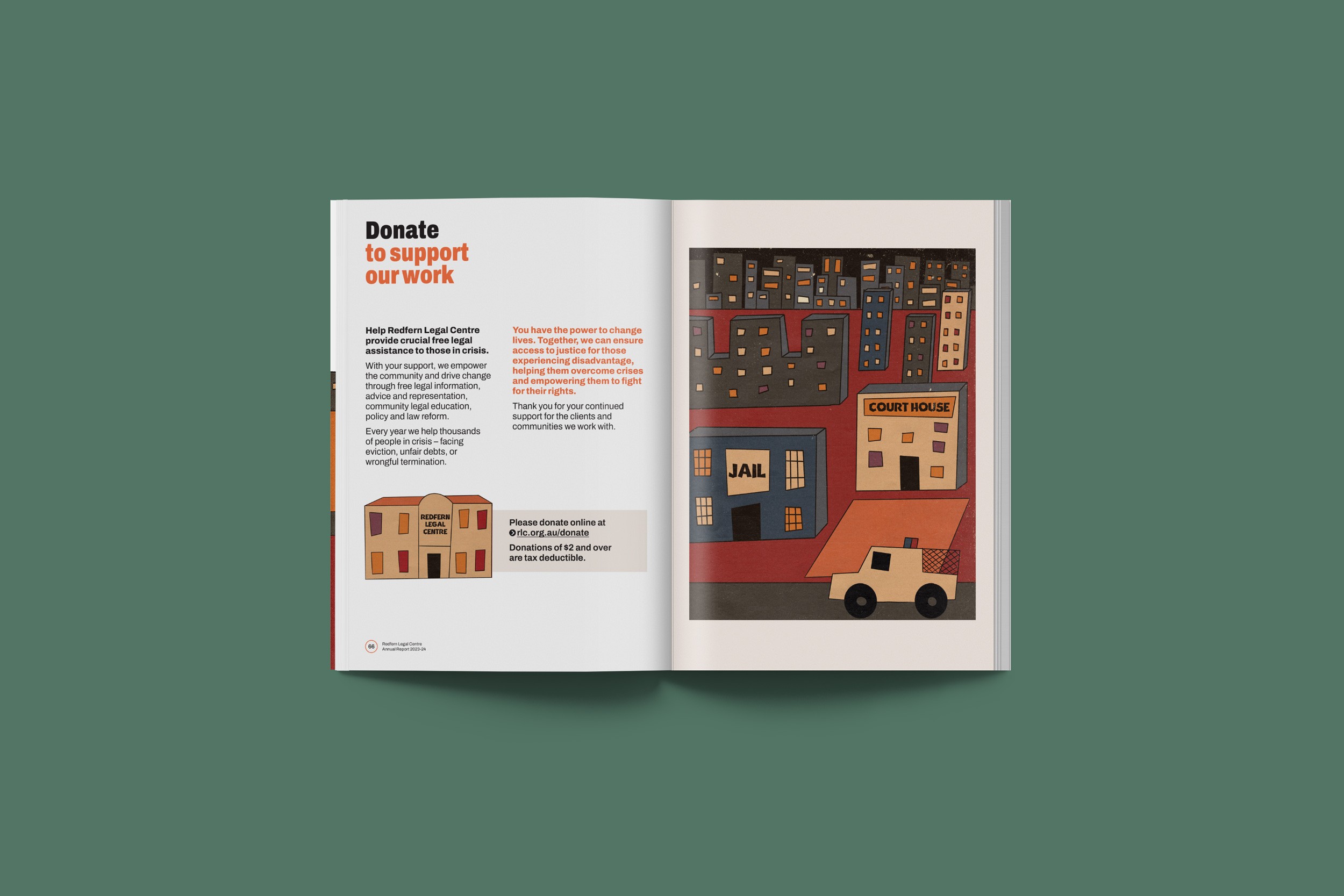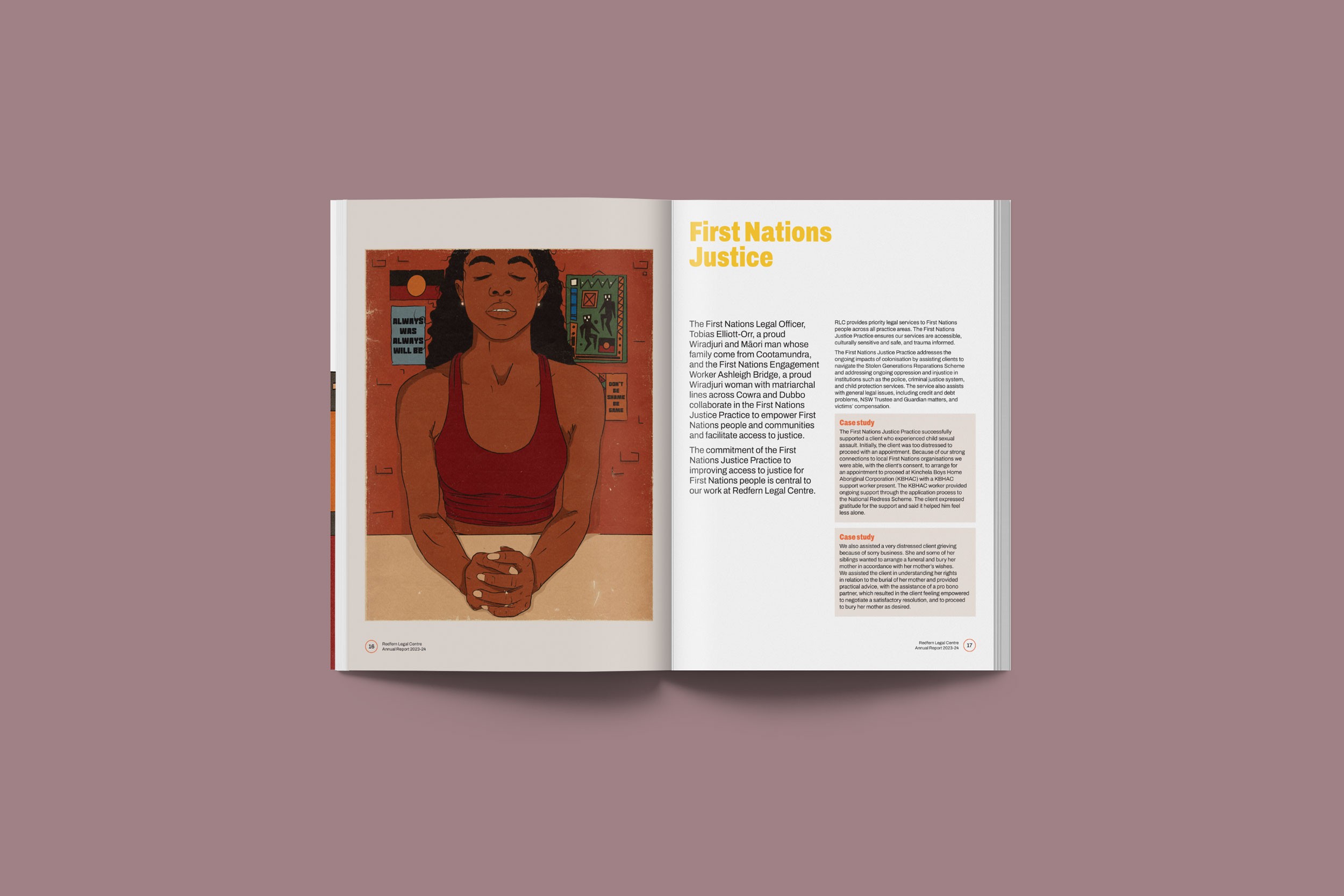 Redfern Legal Centre work alongside individuals and organisations to drive justice and equality in our communities. Through partnerships and advocacy they work to challenge inequality and push for policy and law reforms, providing outreach services that assist disadvantaged people across New South Wales. We collaborated with Redfern Legal Centre on their 2024 annual report design featuring illustrations by Oumoula Mckenzie.