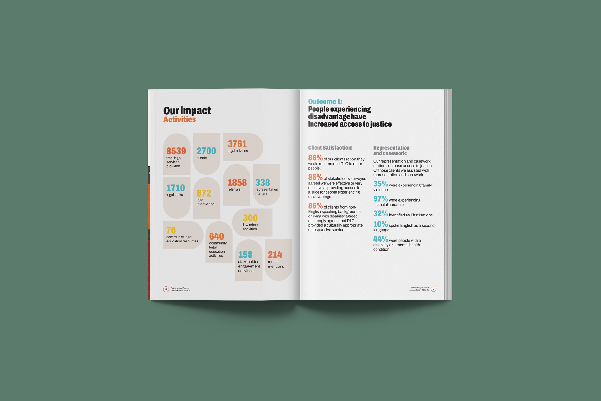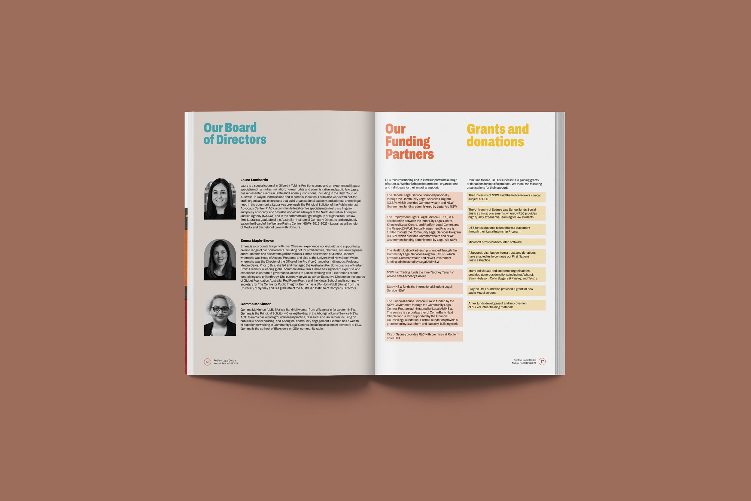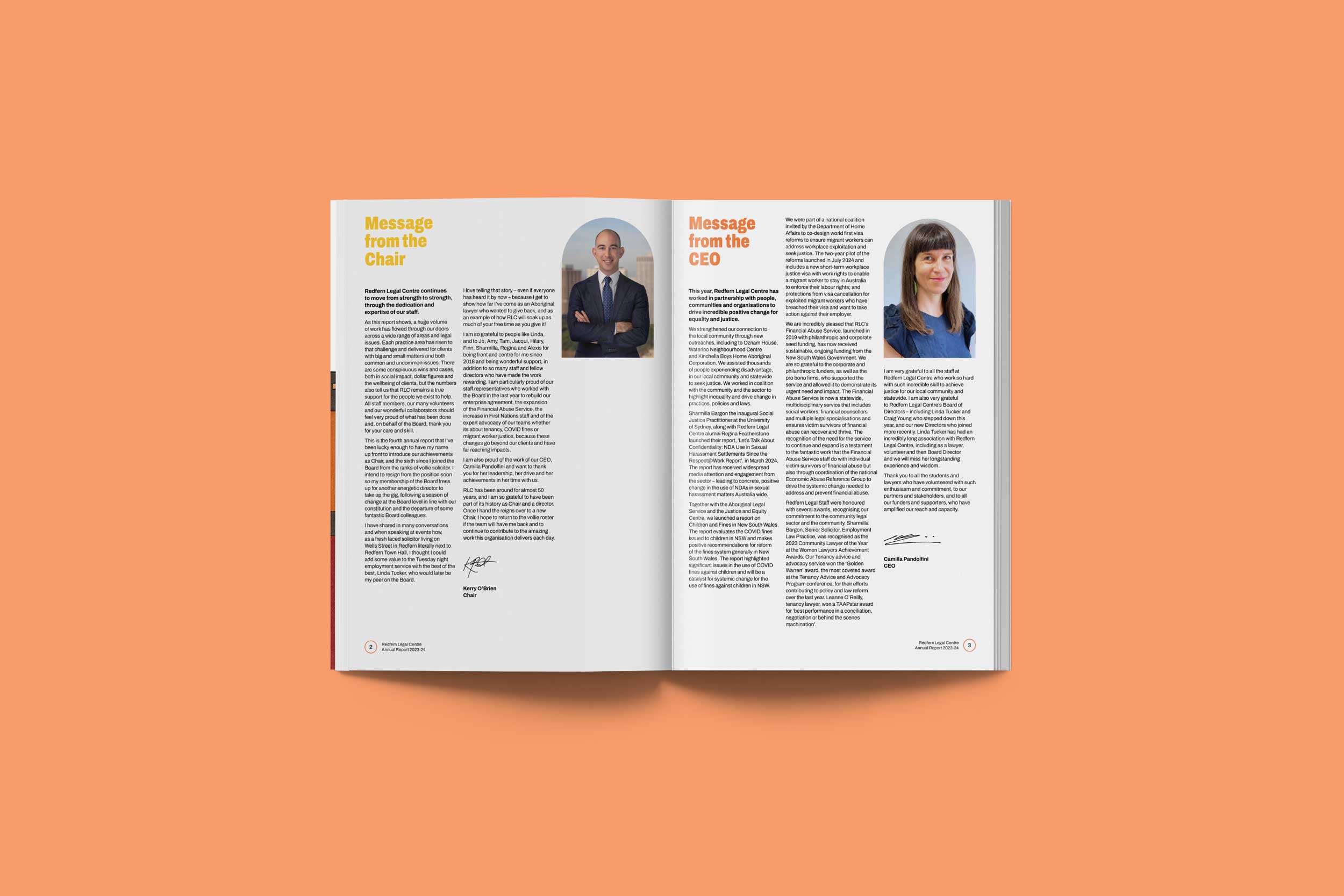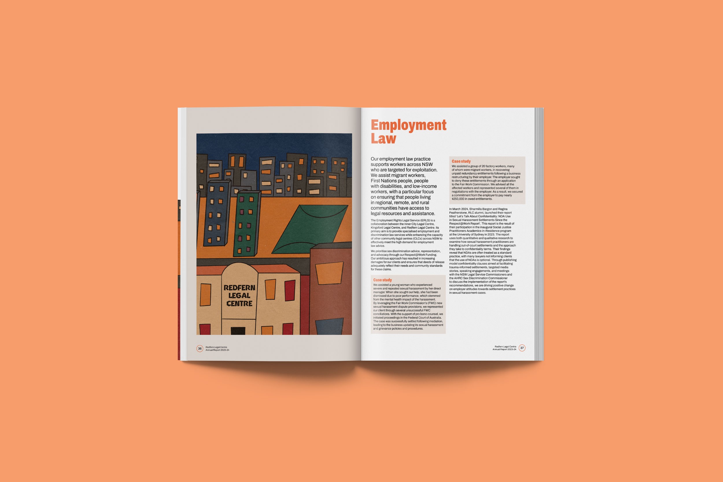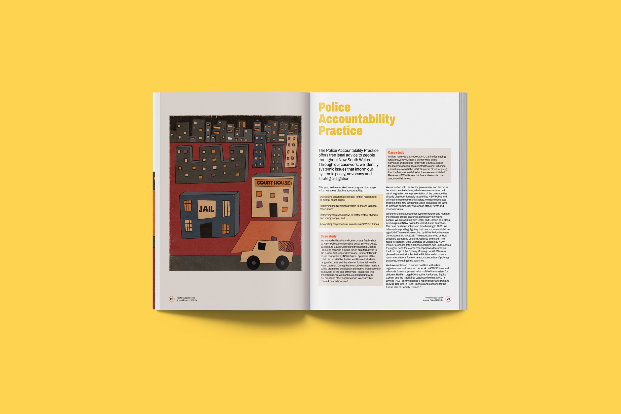 Redfern Legal Centre work alongside individuals and organisations to drive justice and equality in our communities. Through partnerships and advocacy they work to challenge inequality and push for policy and law reforms, providing outreach services that assist disadvantaged people across New South Wales. We collaborated with Redfern Legal Centre on their 2024 annual report design featuring illustrations by Oumoula Mckenzie.